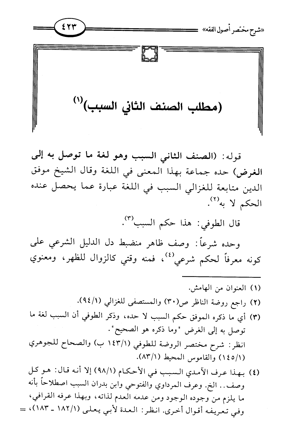 (¬3) أي ما ذكره الموفق حكم السبب لا حده، وذكر الطوفي أن السبب لغة ما توصل به إلى الغرض "وما ذكره هو الصحيح".