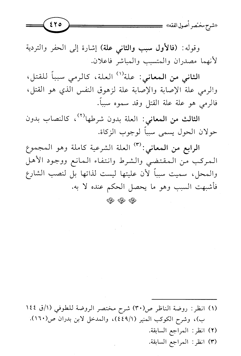 الرابع من المعاني: (¬3) العلة الشرعية كاملة وهو المجموع المركب من المقتضي والشرط وانتفاء المانع ووجود الأول والمحل، سميت سببًا لأن عليتها ليست لذاتها بل لنصب الشارع فأشبهت السبب وهو ما يحصل الحكم عنده لا به.