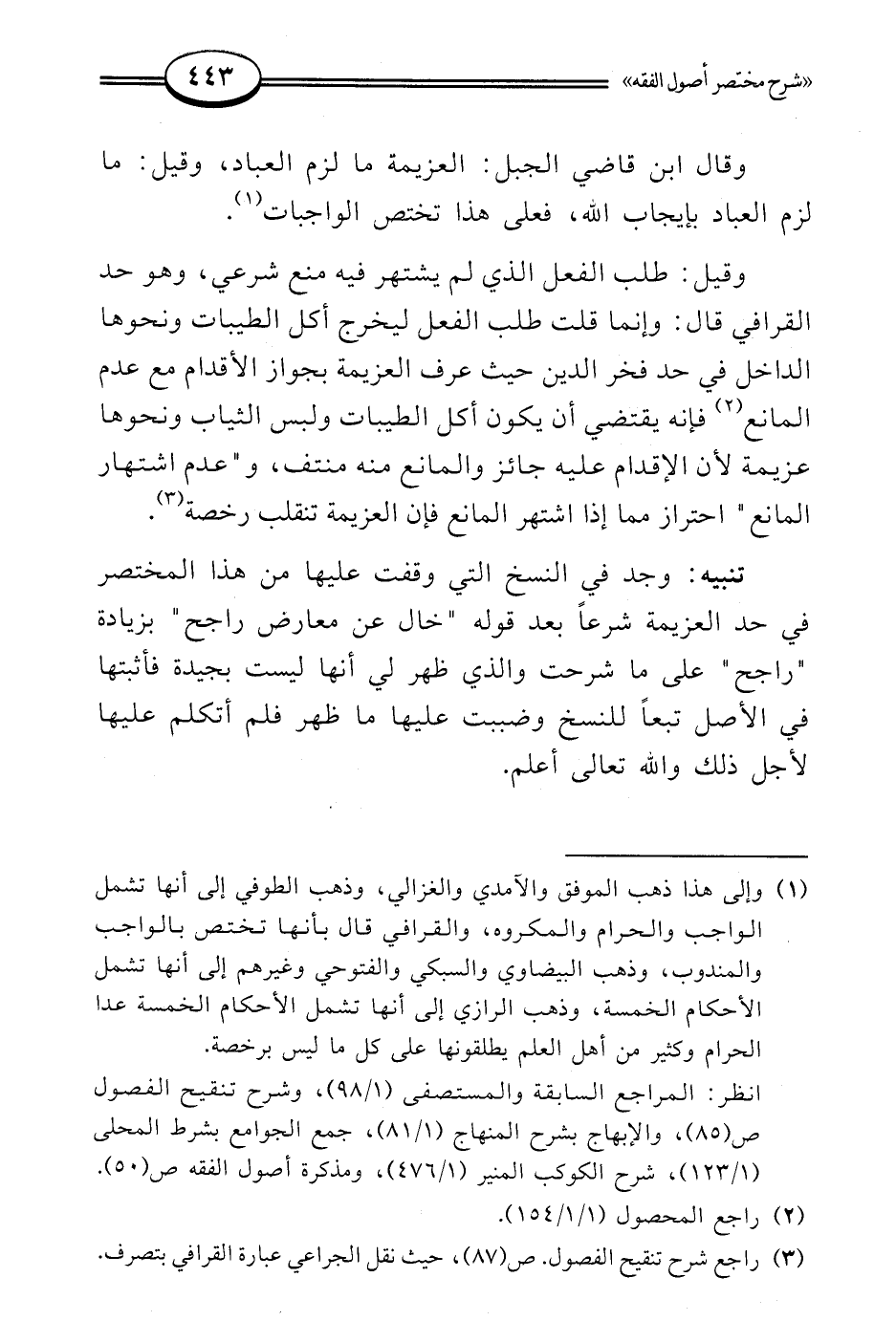 تنبيه: وجد في النسخ التي وقفت عليها من هذا المختصر في حد العزيمة شرعًا بعد قوله "خال عن معارض راجح" بزيادة "راجح" على ما شرحت والذي ظهر لي أنها ليست بجيدة فأثبتها في الأصل تبعًا للنسخ وضببت عليها ما ظهر فلم أتكلم عليها لأجل ذلك والله تعالى أعلم.