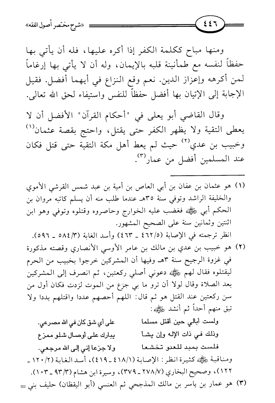 وقال القاضي أبو يعلى في "أحكام القرآن" الأفضل أن لا يعطي التقية ولا يظهر الكفر حتى يقتل، واحتج بقصة عثمان (¬1) وخبيب بن عدي (¬2) حيث لم يعط أهل مكة التقية حتى قتل فكان عند المسلمين أفضل من عمار (¬3).