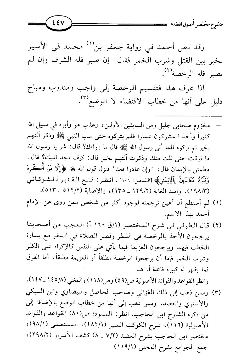 (¬2) قال الطوفي في شرح المختصر (1/ ق 160 أ) العجب من أصحابنا يرجحون الأخذ بالرخصة في الفطر وقصر الصلاة في السفر مع يسارة الخطب فيهما ويرجحون العزيمة فيما يأتي على النفس كالإكراه على الكفر وشرب الخمر فإما أن يرجحوا الرخصة مطلقًا أو العزيمة مطلقًا، أما الفرق فما يظهر له كبيرة فائدة أ. هـ.