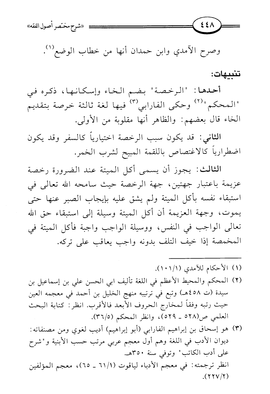 الثالث: يجوز أن يسمى أكل الميتة عند الضرورة رخصة عزيمة باعتبار جهتين، جهة الرخصة حيث سامحه الله تعالى في استبقاء نفسه بأكل الميتة ولم يشق عليه بإيجاب الصبر عنها حتى يموت، وجهة العزيمة أن أكل الميتة وسيلة إلى استبقاء حق الله تعالى الواجب في النفس، ووسيلة الواجب واجبة فأكل الميتة في المخمصة إذا خيف التلف بدونه واجب يعاقب على تركه.