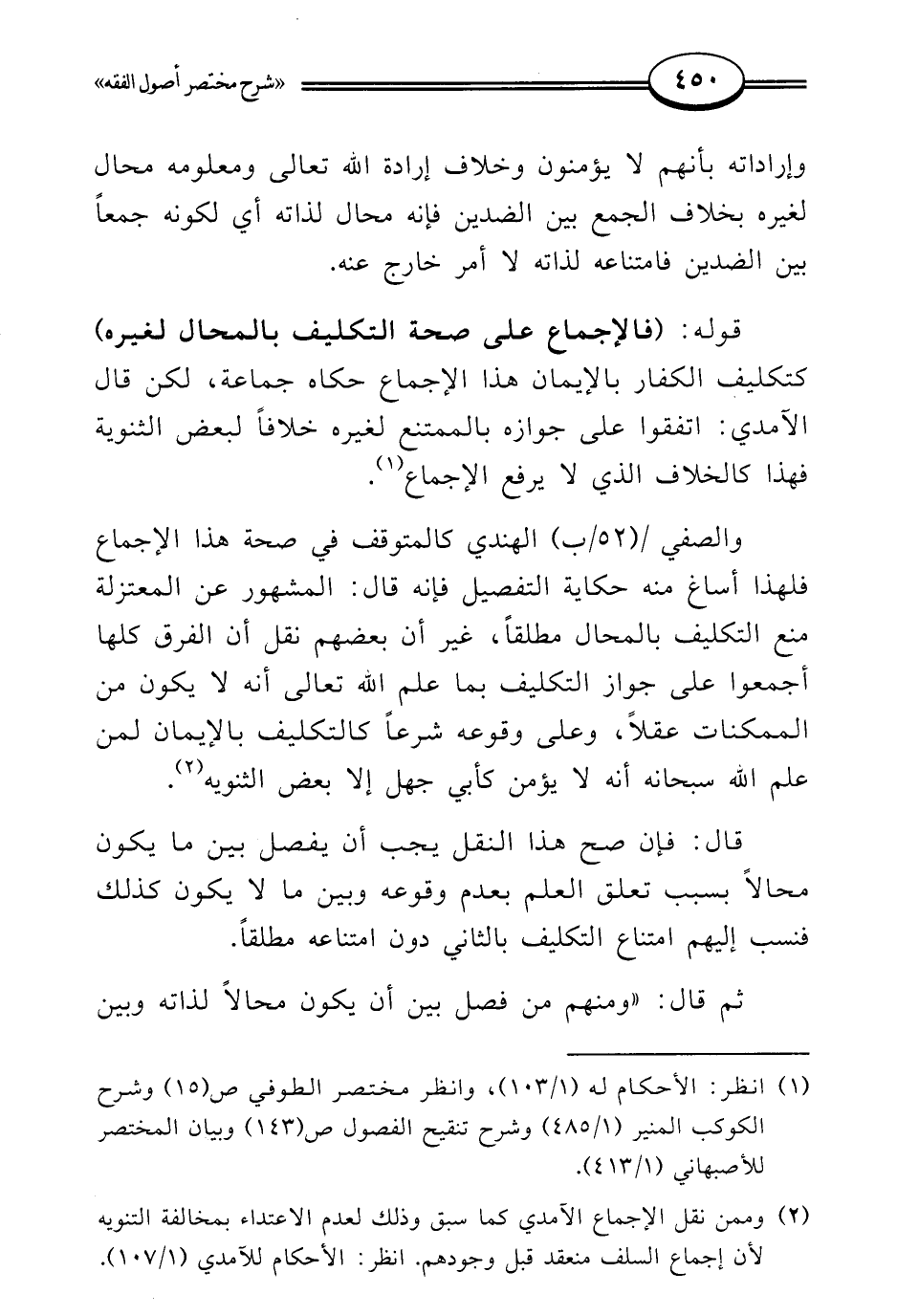 والصفي الهندي كالمتوقف في صحة هذا الإجماع فلهذا أساغ منه حكاية التفصيل فإنه قال: المشهور عن المعتزلة منع التكليف بالمحال مطلقًا، غير أن بعضهم نقل أن الفرق كلها أجمعوا على جواز التكليف بما علم الله تعالى أنه لا يكون من الممكنات عقلًا، وعلى وقوعه شرعًا كالتكليف بالإيمان لمن علم الله سبحانه أنه لا يؤمن كأبي جهل إلا بعض الثنويه (¬2).