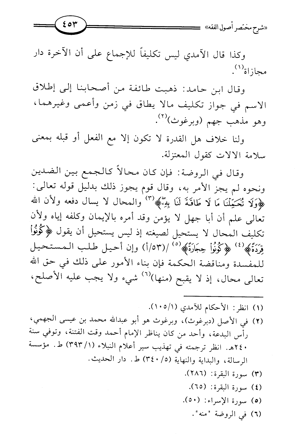 وقال ابن حامد: ذهبت طائفة من أصحابنا إلى إطلاق الاسم في جواز تكليف ما لا يطاق في زمن وأعمى وغيرهما، وهو مذهب جهم (وبرغوث) (¬2).