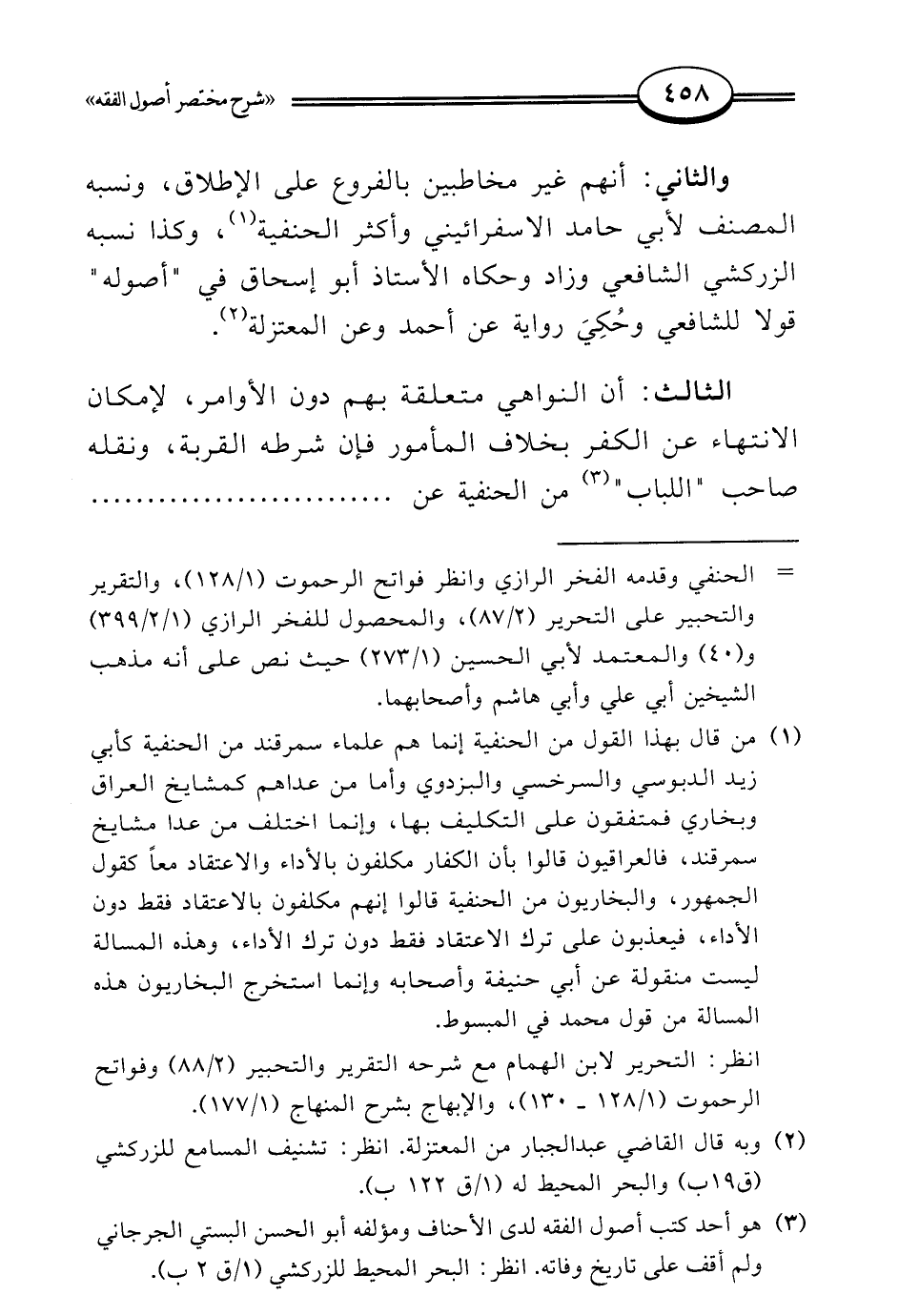 (¬1) من قال بهذا القول من الحنفية إنما هم علماء سمرقند من الحنفية كأبي زيد الدبوسي والسرخسي والبزدوي وأما من عداهم كمشايخ العراق وبخاري فمتفقون على التكليف بها، وإنما اختلف من عدا مشايخ سمرقند، فالعراقيون قالوا بأن الكفار مكلفون بالأداء والاعتقاد معًا كقول الجمهور، والبخاريون من الحنفية قالوا إنهم مكلفون بالاعتقاد فقط دون الأداء، فيعذبون على ترك الاعتقاد فقط دون ترك الأداء، وهذه المسألة ليست منقولة عن أبي حنيفة وأصحابه وإنما استخرج البخاريون هذه المسألة من قول محمد في المبسوط.