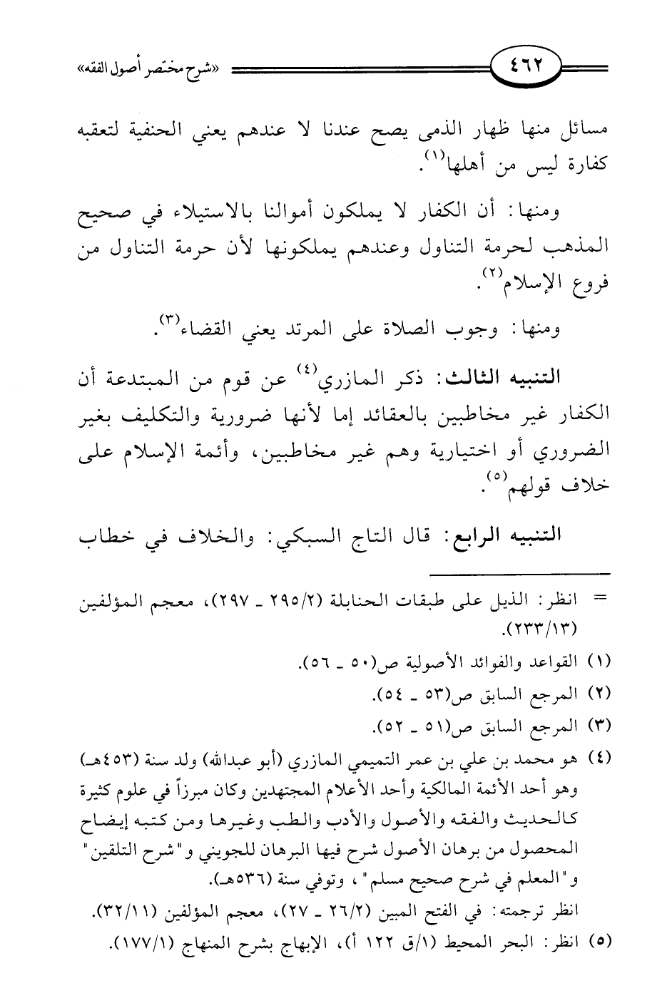 (¬4) هو محمد بن علي بن عمر التميمي المازري (أبو عبد الله) ولد سنة (453 هـ) وهو أحد الأئمة المالكية وأحد الأعلام المجتهدين وكان مبرزًا في علوم كثيرة كالحديث والفقه والأصول والأدب والطب وغيرها ومن كتبه إيضاح المحصول من برهان الأصول شرح فيها البرهان للجويني و"شرح التلقين" و"المعلم في شرح صحيح مسلم"، وتوفي سنة (536 هـ).