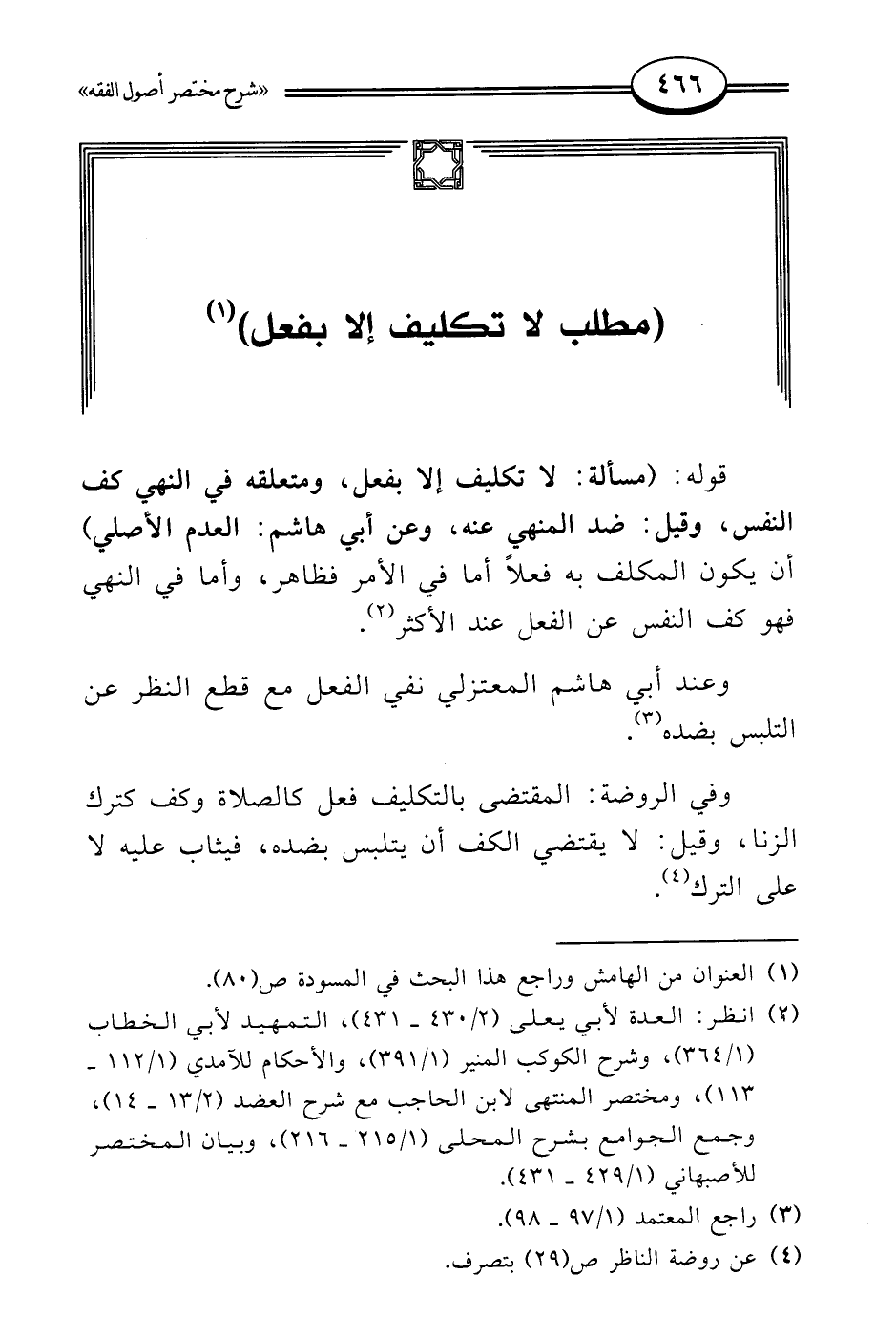 قوله: (مسألة: لا تكليف إلا بفعل، ومتعلقه في النهي كف النفس، وقيل: ضد المنهي عنه، وعن أبي هاشم: العدم الأصلي) أن يكون المكلف به فعلًا أما في الأمر فظاهر، وأما في النهي فهو كف النفس عن الفعل عند الأكثر (¬2).