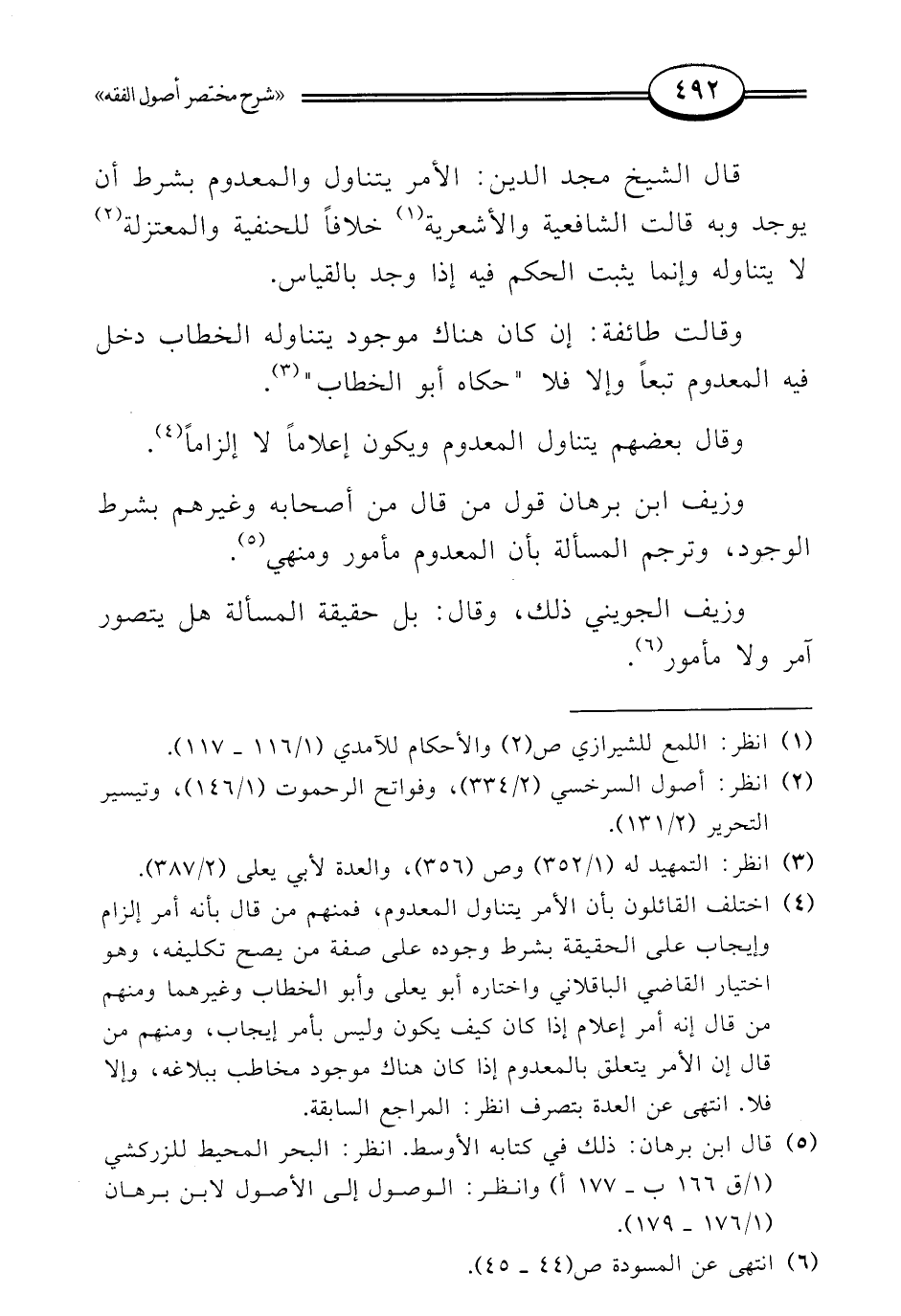 وزيف ابن برهان قول من قال من أصحابه وغيرهم بشرط الوجود، وترجم المسألة بأن المعدوم مأمور ومنهي (¬5).