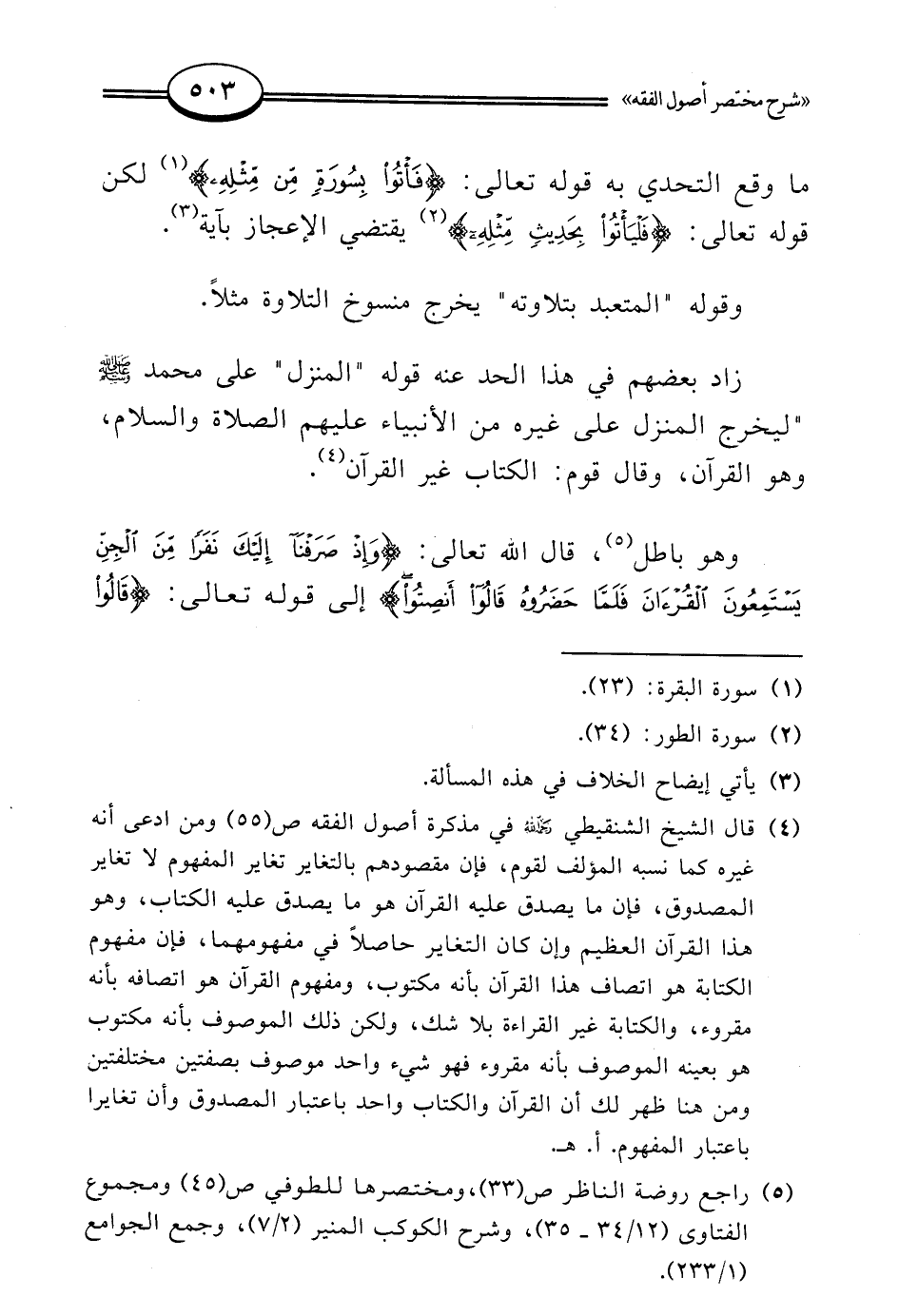 (¬4) قال الشيخ الشنقيطي رحمه الله في مذكرة أصول الفقه ص (55) ومن ادعى أنه غيره كما نسبه المؤلف لقوم، فإن مقصودهم بالتغاير تغاير المفهوم لا تغاير المصدوق، فإن ما يصدق عليه القرآن هو ما يصدق عليه الكتاب، وهو هذا القرآن العظيم وإن كان التغاير حاصلًا في مفهومهما، فإن مفهوم الكتابة هو اتصاف هذا القرآن بأنه مكتوب، ومفهوم القرآن هو اتصافه بأنه مقروء، والكتابة غير القراءة بلا شك، ولكن ذلك الموصوف بأنه مكتوب هو بعينه الموصوف بأنه مقروء فهو شيء واحد موصوف بصفتين مختلفتين ومن هنا ظهر لك أن القرآن والكتاب واحد باعتبار المصدوق وأن تغايرا باعتبار المفهوم. أ. هـ.