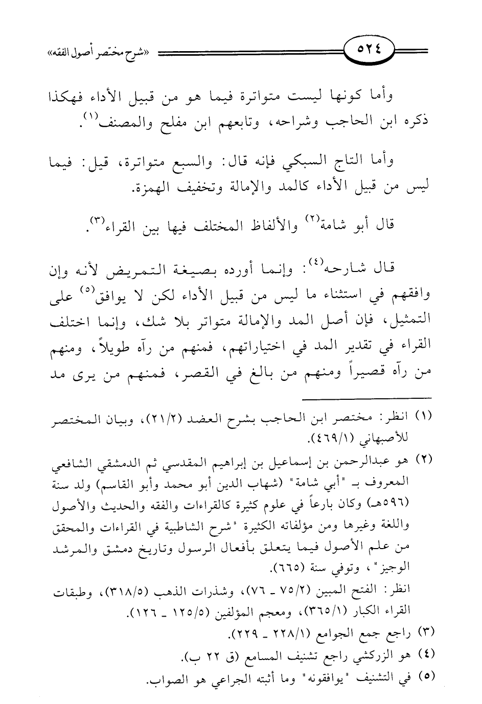 وأما كونها ليست متواترة فيما هو من قبيل الأداء فهكذا ذكره ابن الحاجب وشراحه، وتابعهم ابن مفلح والمصنف (¬1).