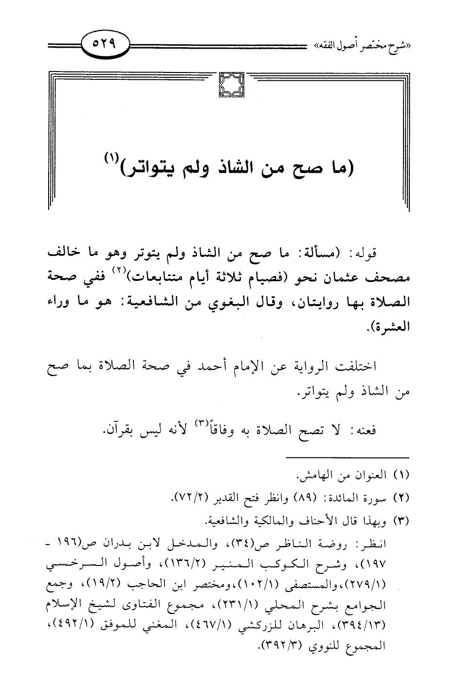 قوله: (مسألة: ما صح من الشاذ ولم يتوتر وهو ما خالف مصحف عثمان نحو (فصيام ثلاثة أيام متتابعات) (¬2) ففي صحة الصلاة بها روايتان، وقال البغوي من الشافعية: هو ما وراء العشرة).