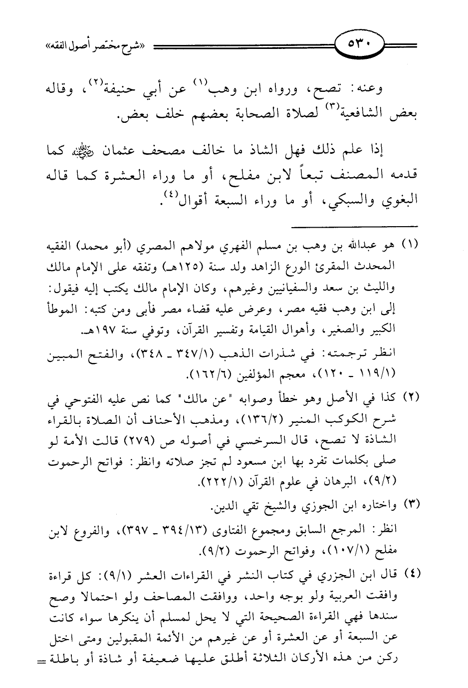 (¬2) كذا في الأصل وهو خطأ وصوابه "عن مالك" كما نص عليه الفتوحي في شرح الكوكب المنير (2/ 136)، ومذهب الأحناف أن الصلاة بالقراء الشاذة لا تصح، قال السرخسي في أصوله ص (279) قالت الأمة لو صلى بكلمات تفرد بها ابن مسعود لم تجز صلاته وانظر: فواتح الرحموت (2/ 9)، البرهان في علوم القرآن (1/ 222).