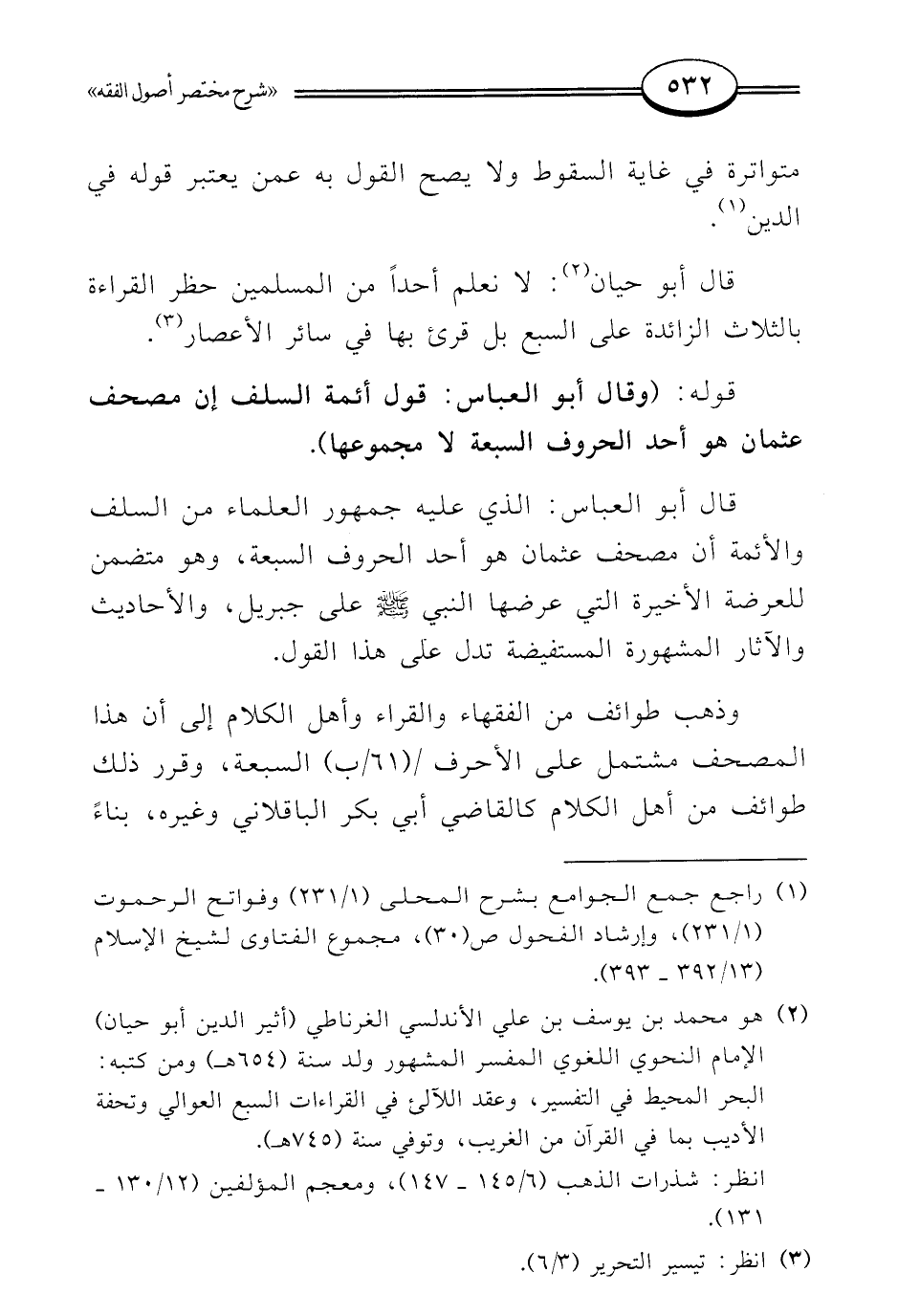 (¬1) راجع جمع الجوامع بشرح المحلى (1/ 231) وفواتح الرحموت (1/ 231)، وإرشاد الفحول ص (30)، مجموع الفتاوى لشيخ الإسلام (13/ 392 - 393).