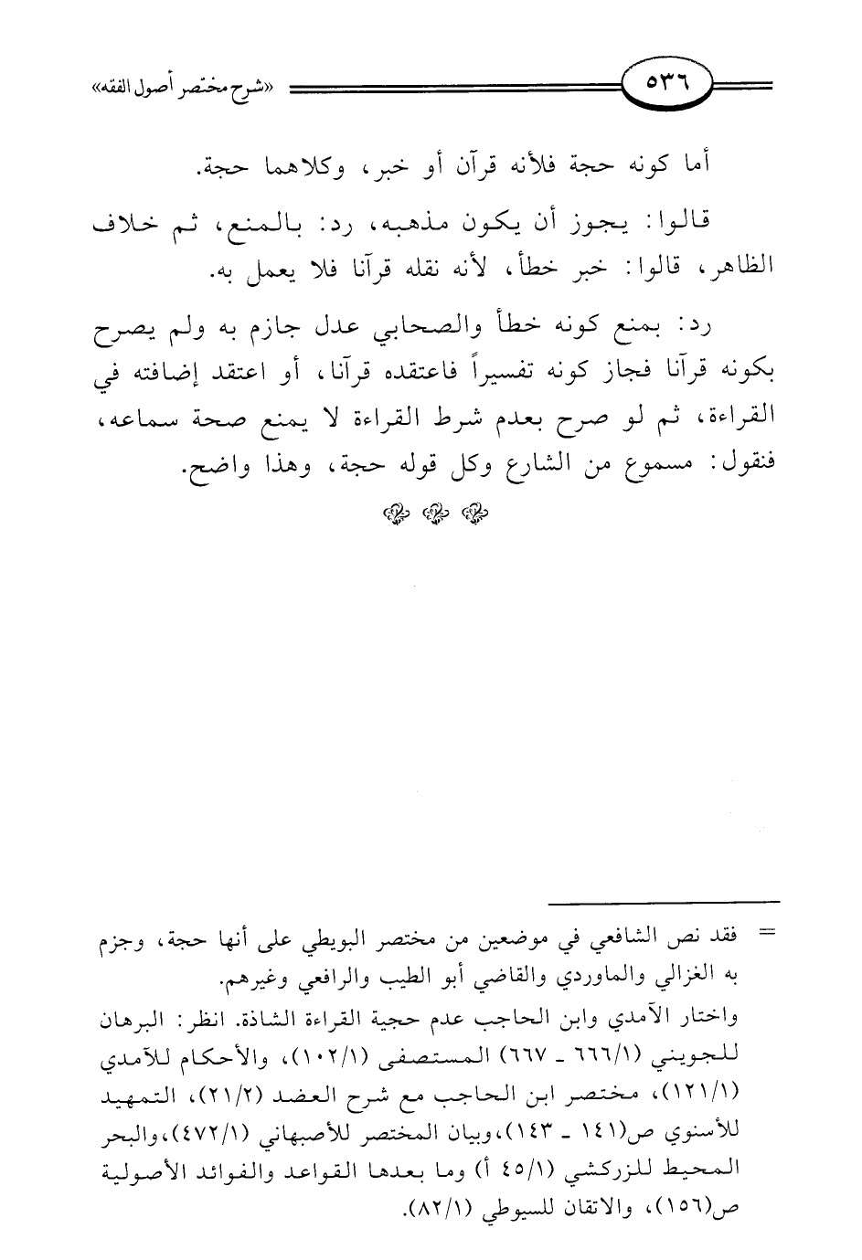 واختار الآمدي وابن الحاجب عدم حجية القراءة الشاذة. انظر: البرهان للجويني (1/ 666 - 667) المستصفى (1/ 102)، والأحكام للآمدي (1/ 121)، مختصر ابن الحاجب مع شرح العضد (2/ 21)، التمهيد للأسنوي ص (141 - 143)، وبيان المختصر للأصبهاني (1/ 472)، والبحر المحيط للزركشي (1/ 45 أ) وما بعدها القواعد والفوائد الأصولية ص (156)، والإتقان للسيوطي (1/ 82).