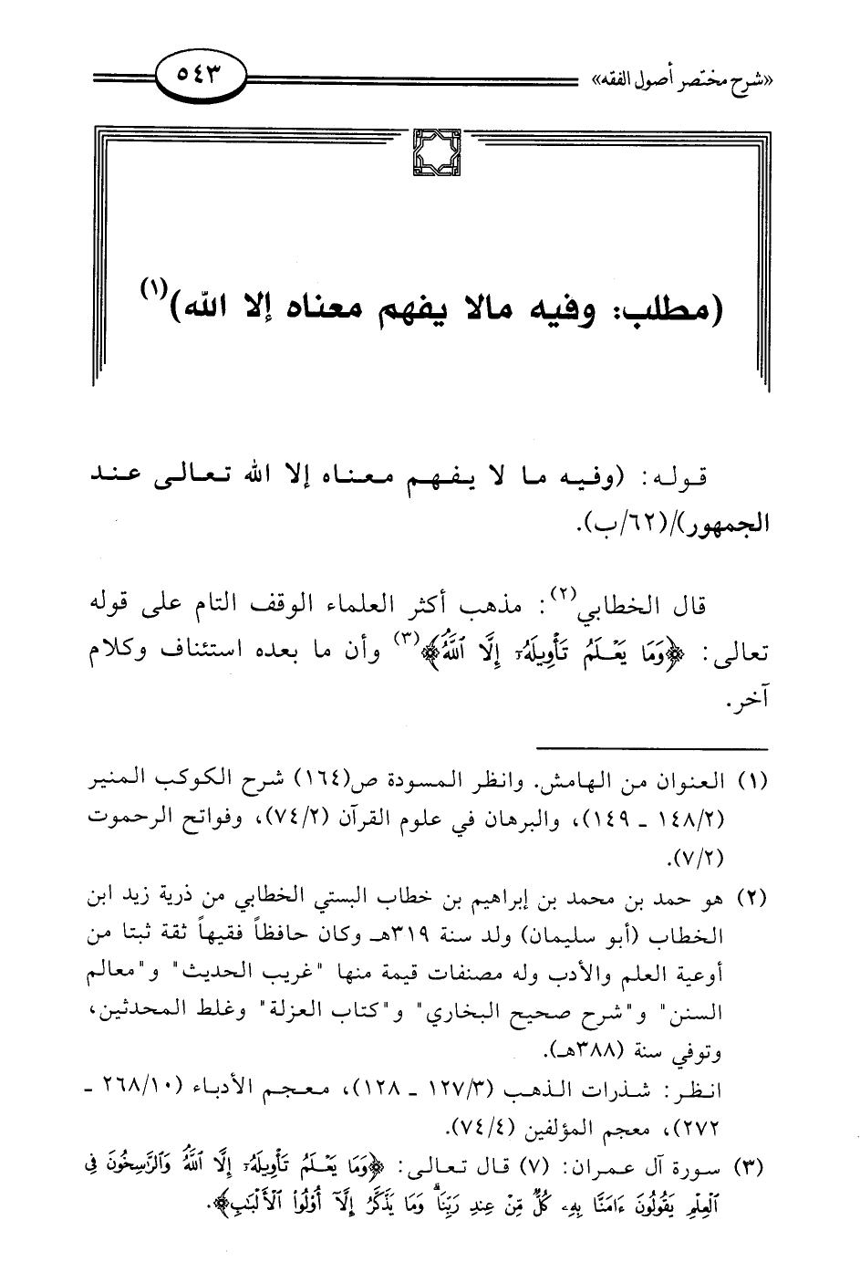(¬3) سورة آل عمران: (7) قال تعالى: {وَمَا يَعْلَمُ تَأْوِيلَهُ إِلَّا اللَّهُ وَالرَّاسِخُونَ فِي الْعِلْمِ يَقُولُونَ آمَنَّا بِهِ كُلٌّ مِنْ عِنْدِ رَبِّنَا وَمَا يَذَّكَّرُ إِلَّا أُولُو الْأَلْبَابِ}.