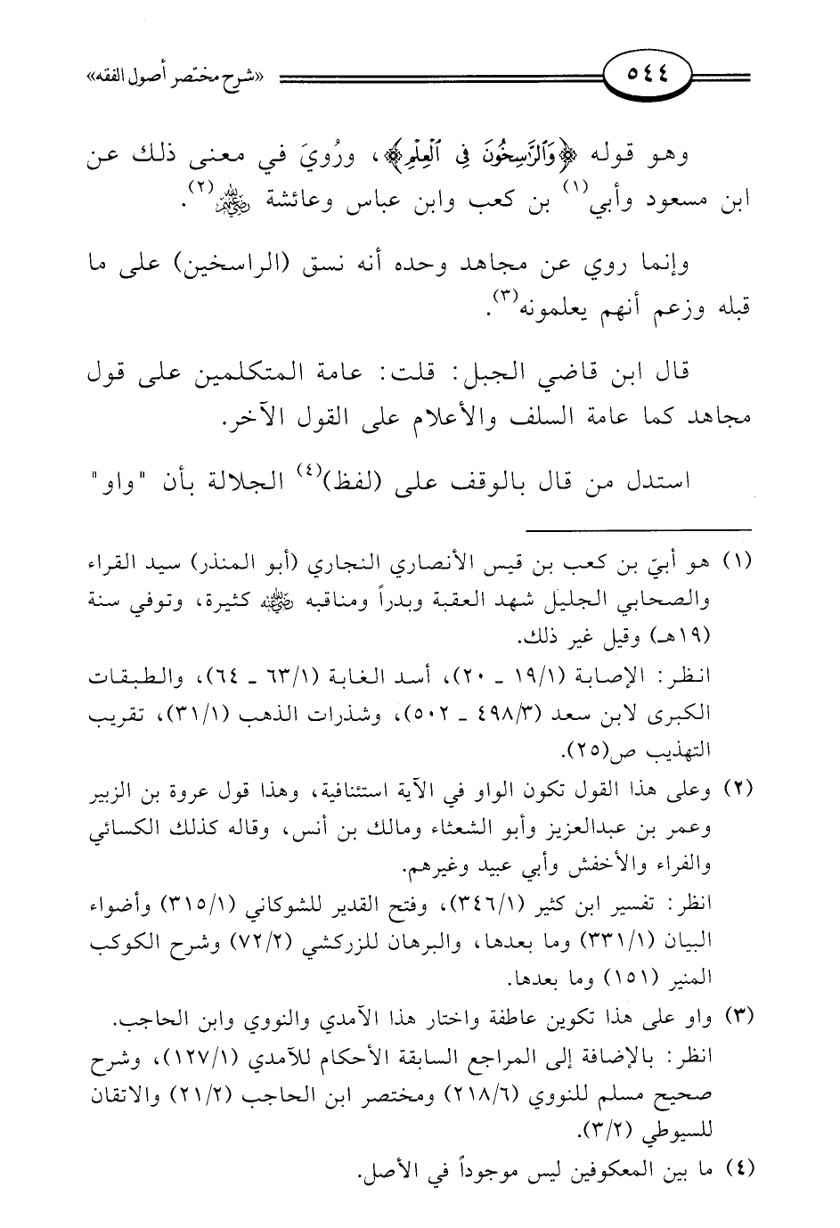 وهو قوله {وَالرَّاسِخُونَ فِي الْعِلْم}، ورُويَ في معنى ذلك عن ابن مسعود وأبي (¬1) بن كعب وابن عباس وعائشة - رضي الله عنهم - (¬2).