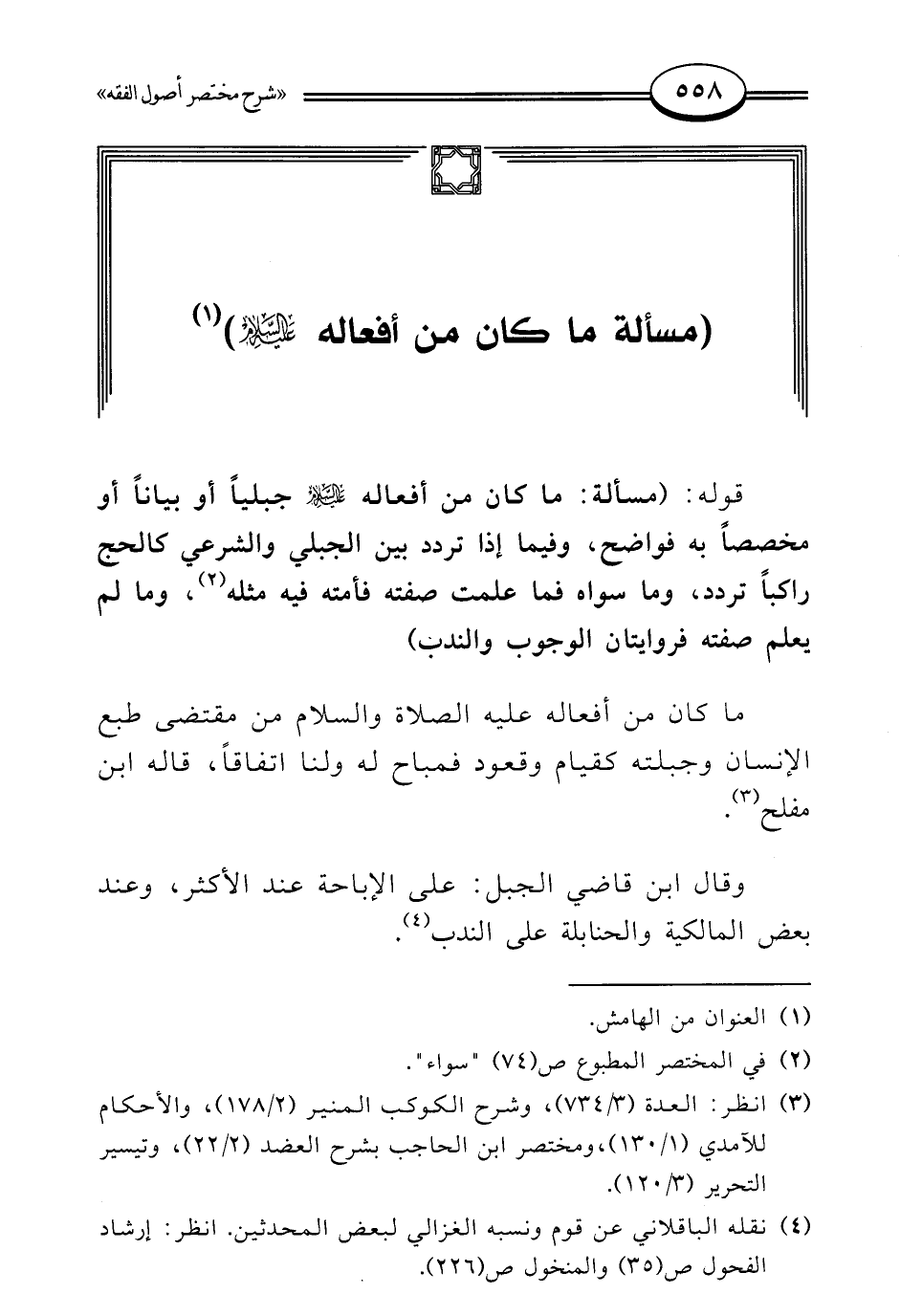 قوله: (مسألة: ما كان من أفعاله عليه السلام جبليًا أو بيانًا أو مخصصًا به فواضح، وفيما إذا تردد بين الجبلي والشرعي كالحج راكبًا تردد، وما سواه فما علمت صفته فأمته فيه مثله (¬2)، وما لم يعلم صفته فروايتان الوجوب والندب)