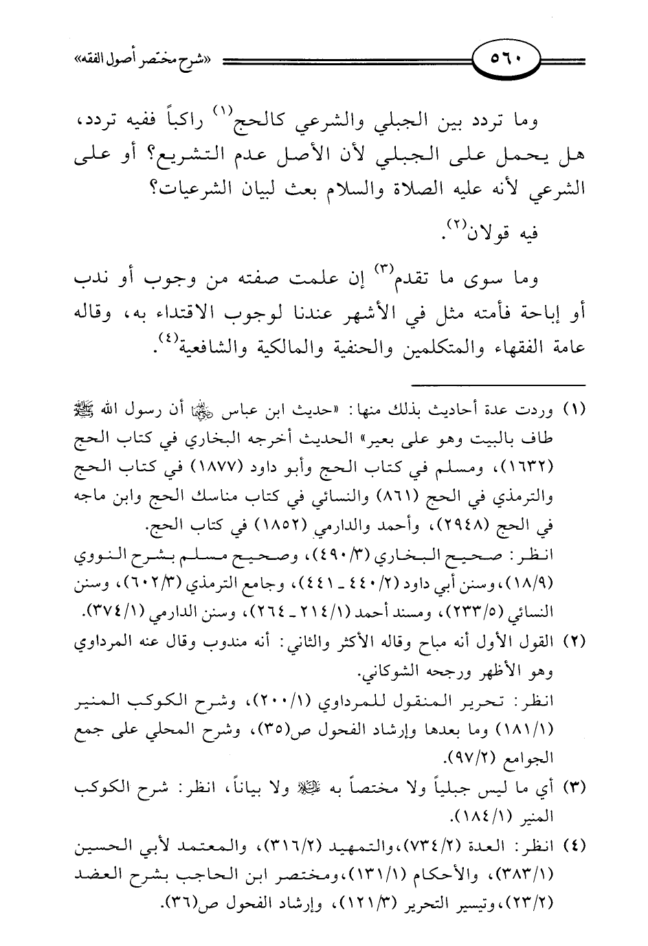 وما تردد بين الجبلي والشرعي كالحج (¬1) راكبًا ففيه تردد، هل يحمل على الجبلي لأن الأصل عدم التشريع؟ أو على الشرعي لأنه عليه الصلاة والسلام بعث لبيان الشرعيات؟ فيه قولان (¬2).