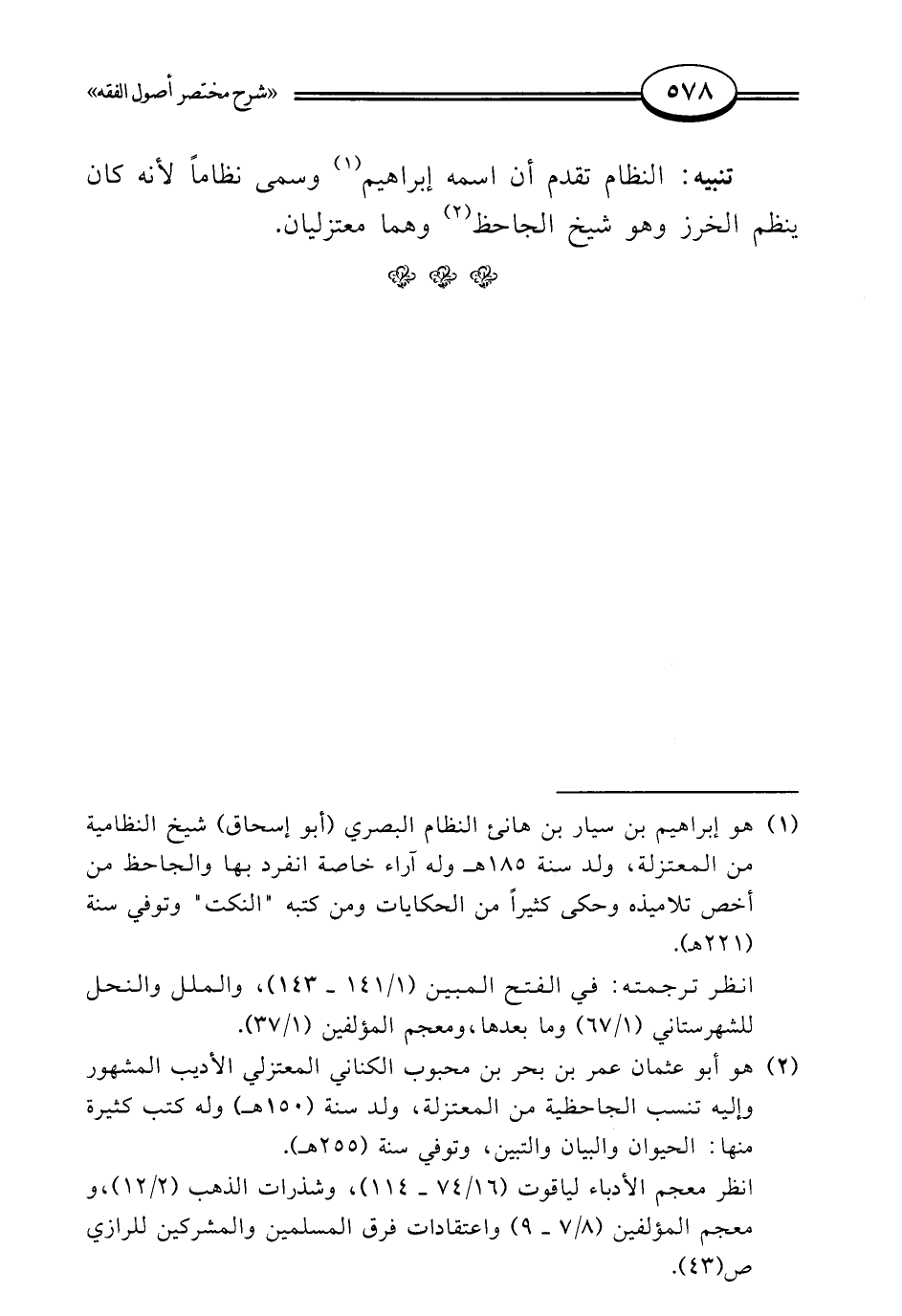 (¬1) هو إبراهيم بن سيار بن هانئ النظام البصري (أبو إسحاق) شيخ النظامية من المعتزلة، ولد سنة 185 هـ وله آراء خاصة انفرد بها والجاحظ من أخص تلاميذه وحكى كثيرًا من الحكايات ومن كتبه "النكت" وتوفي سنة (221 هـ).