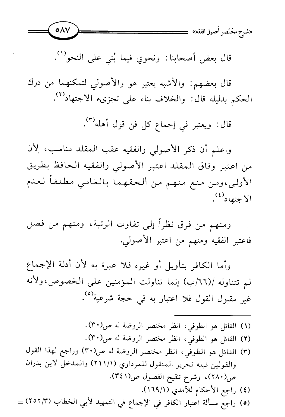 (¬3) القائل هو الطوفي، انظر مختصر الروضة له ص (30) وراجع لهذا القول والقولين قبله تحرير المنقول للمرداوي (1/ 211) والمدخل لابن بدران ص (280)، وشرح تنقيح الفصول ص (341).