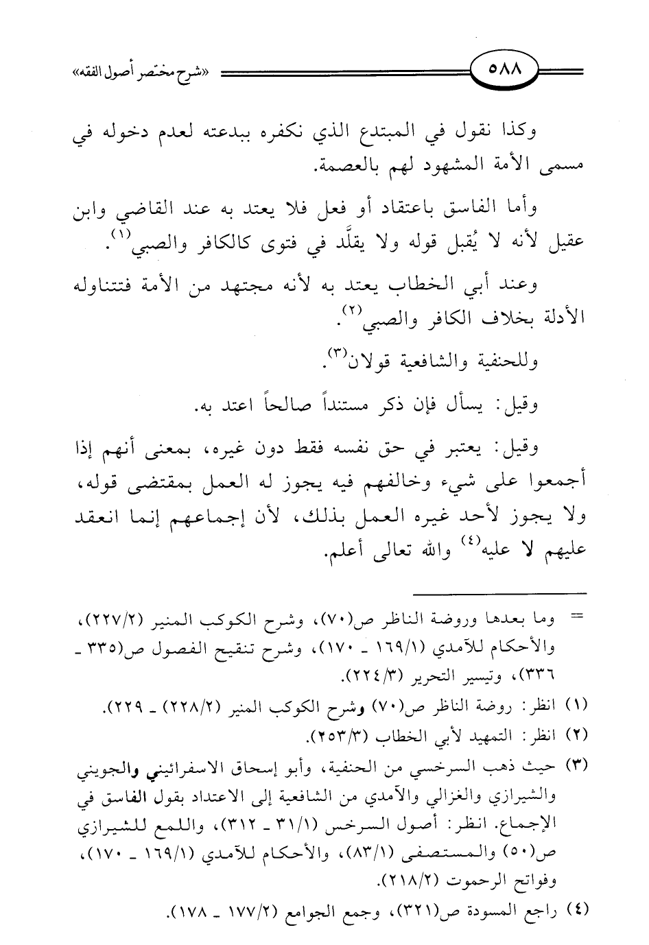 (¬3) حيث ذهب السرخسي من الحنفية، وأبو إسحاق الإسفرائيني والجويني والشيرازي والغزالي والآمدي من الشافعية إلى الاعتداد بقول الفاسق في الإجماع. انظر: أصول السرخسي (1/ 31 - 312)، واللمع للشيرازي ص (50) والمستصفى (1/ 83)، والأحكام للآمدي (1/ 169 - 170)، وفواتح الرحموت (2/ 218).