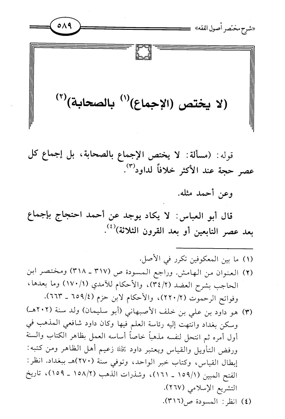 قوله: (مسألة: لا يختص الإجماع بالصحابة، بل إجماع كل عصر حجة عند الأكثر خلافًا لداود (¬3).