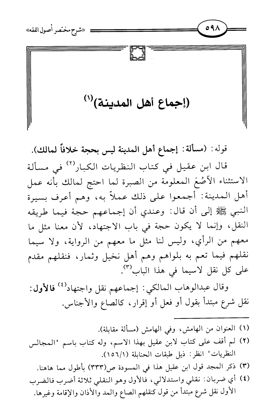 قال ابن عقيل في كتاب النظريات الكبار (¬2) في مسألة الاستثناء الآصُعَ المعلومة من الصبرة لما احتج لمالك بأنه عمل أهل المدينة: أجمعوا على ذلك عملًا به، وهم أعرف بسيرة النبي - صلى الله عليه وسلم - إلى أن قال: وعندي أن إجماعهم حجة فيما طريقه النقل، وإنما لا يكون حجة في باب الاجتهاد، لأن معنا مثل ما معهم من الرأي، وليس لنا مثل ما معهم من الرواية، ولا سيما نقلهم فيما تعم به بلواهم وهم أهل نخيل وثمار، فنقلهم مقدم على كل نقل لاسيما في هذا الباب (¬3).