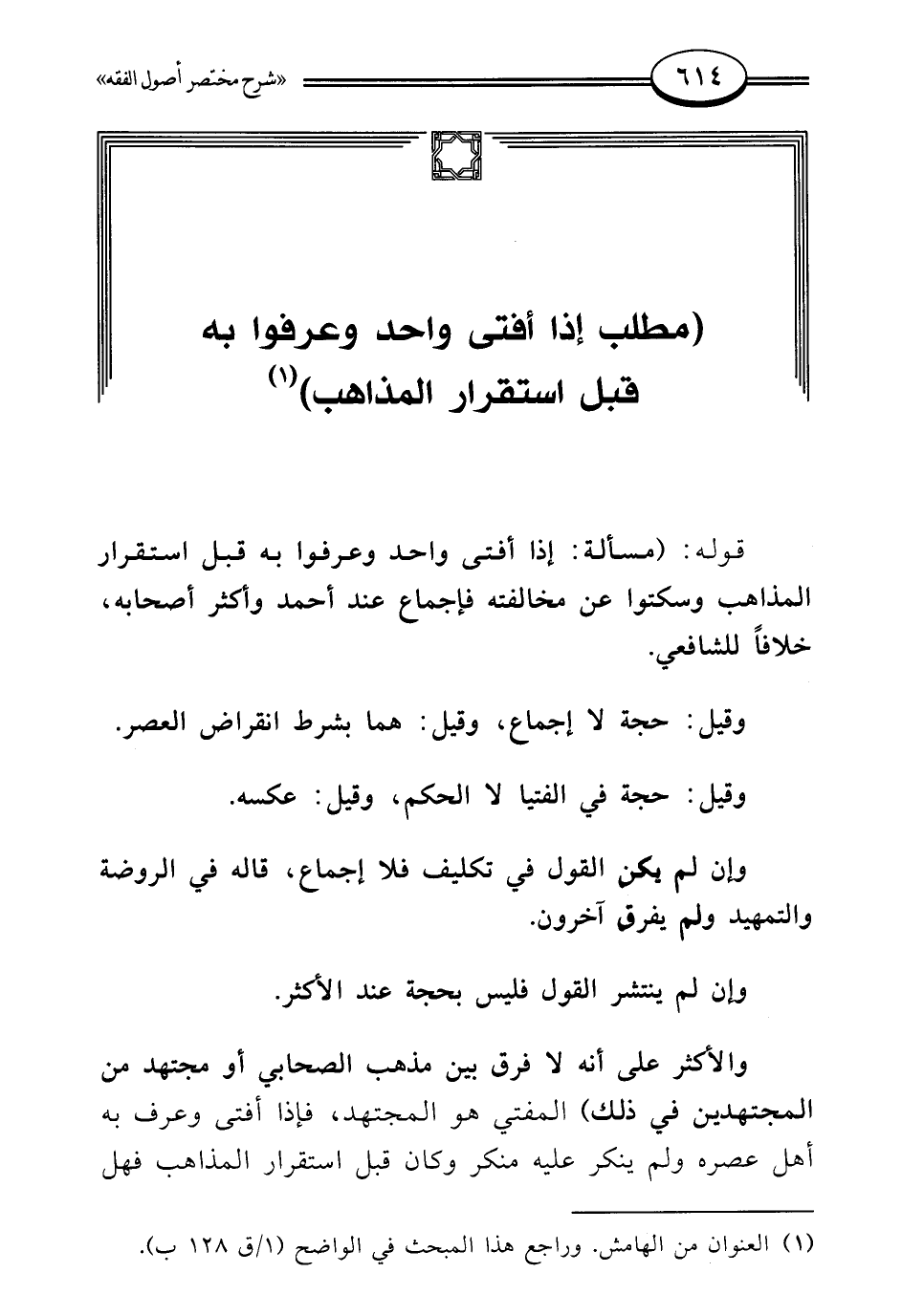 والأكثر على أنه لا فرق بين مذهب الصحابي أو مجتهد من المجتهدين في ذلك) المفتي هو المجتهد، فإذا أفتى وعرف به أهل عصره ولم ينكر عليه منكر وكان قبل استقرار المذاهب فهل