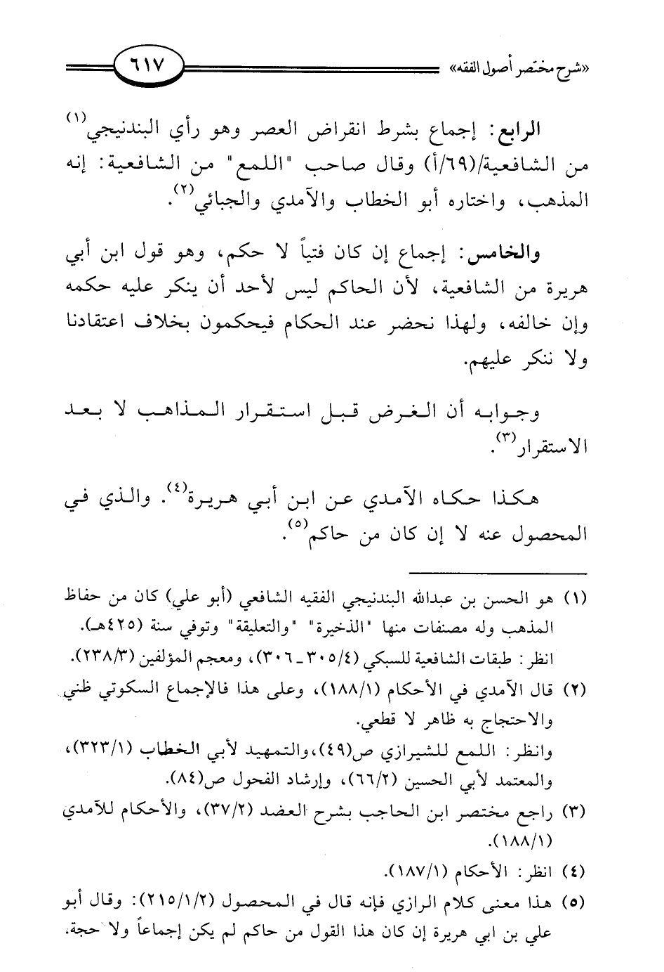 الرابع: إجماع بشرط انقراض العصر وهو رأي البندنيجي (¬1) من الشافعية وقال صاحب "اللمع" من الشافعية: إنه المذهب، واختاره أبو الخطاب والآمدي والجبائي (¬2).
