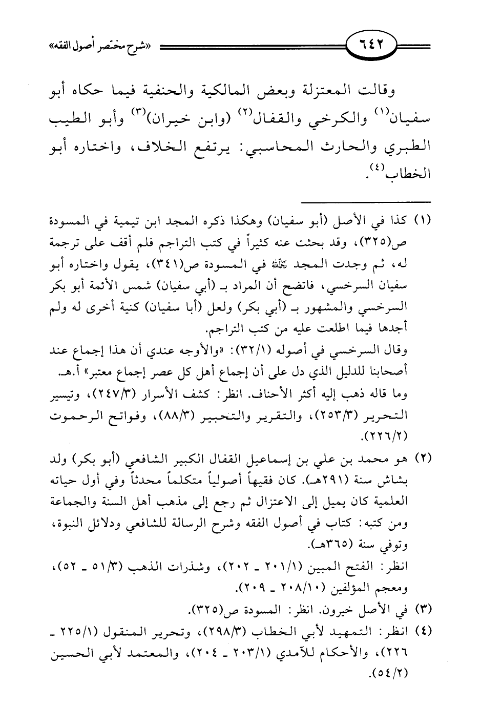 (¬1) كذا في الأصل (أبو سفيان) وهكذا ذكره المجد بن تيمية في المسودة ص (325)، وقد بحثت عنه كثيرًا في كتب التراجم فلم أقف على ترجمة له، ثم وجدت المجد - رحمه الله - في المسودة ص (341)، يقول واختاره أبو سفيان السرخسي، فاتضح أن المراد بـ (أبي سفيان) شمس الأئمة أبو بكر السرخسي والمشهور بـ (أبي بكر) ولعل (أبا سفيان) كنية أخرى له ولم أجدها فيما اطلعت عليه من كتب التراجم.