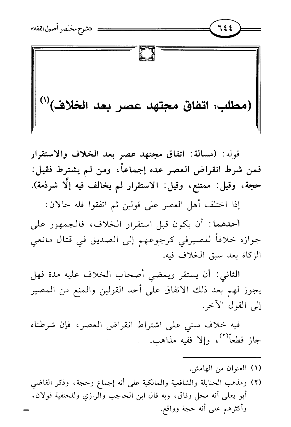 قوله: (مسألة: اتفاق مجتهد عصر بعد الخلاف والاستقرار فمن شرط انقراض العصر عده إجماعًا، ومن لم يشترط فقيل: حجة، وقيل: ممتنع، وقيل: الاستقرار لم يخالف فيه إلَّا شرذمة).