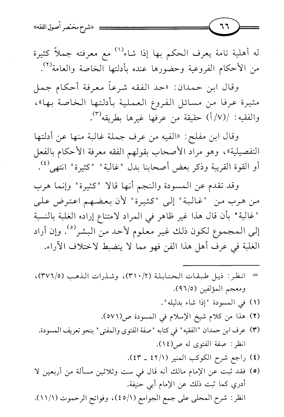 وقال ابن مفلح: "الفيه من عرف جملة غالبة منها عن أدلتها التفصيلية"، وهو مراد الأصحاب بقولهم الفقه معرفة الأحكام بالفعل أو القوة القريبة وذكر بعض أصحابنا بدل "غالبة" "كثيرة" انتهى (¬4).