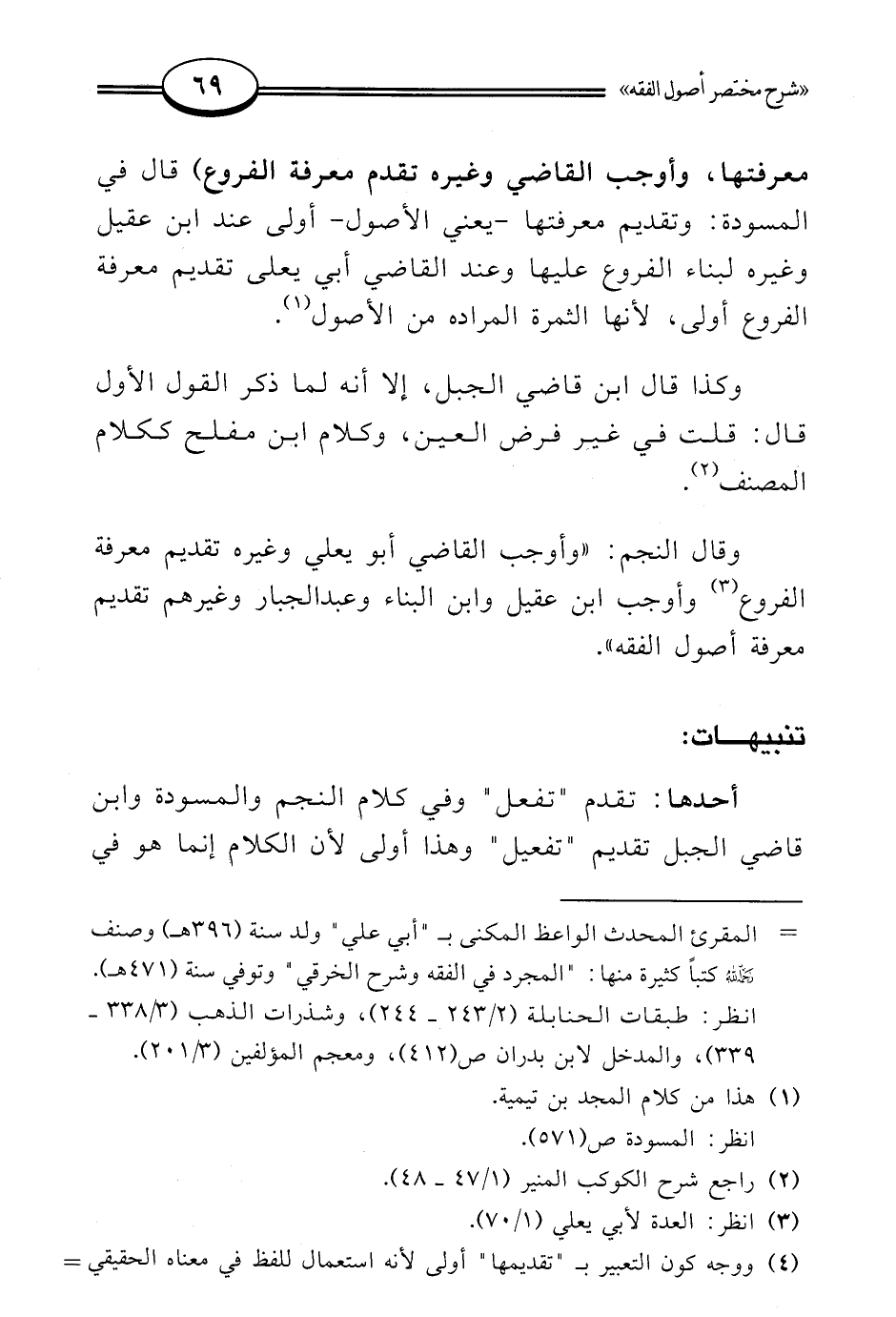 وقال النجم: "وأوجب القاضي أبو يعلي وغيره تقديم معرفة الفروع (¬3) وأوجب ابن عقيل وابن البناء وعبدالجبار وغيرهم تقديم معرفة أصول الفقه".