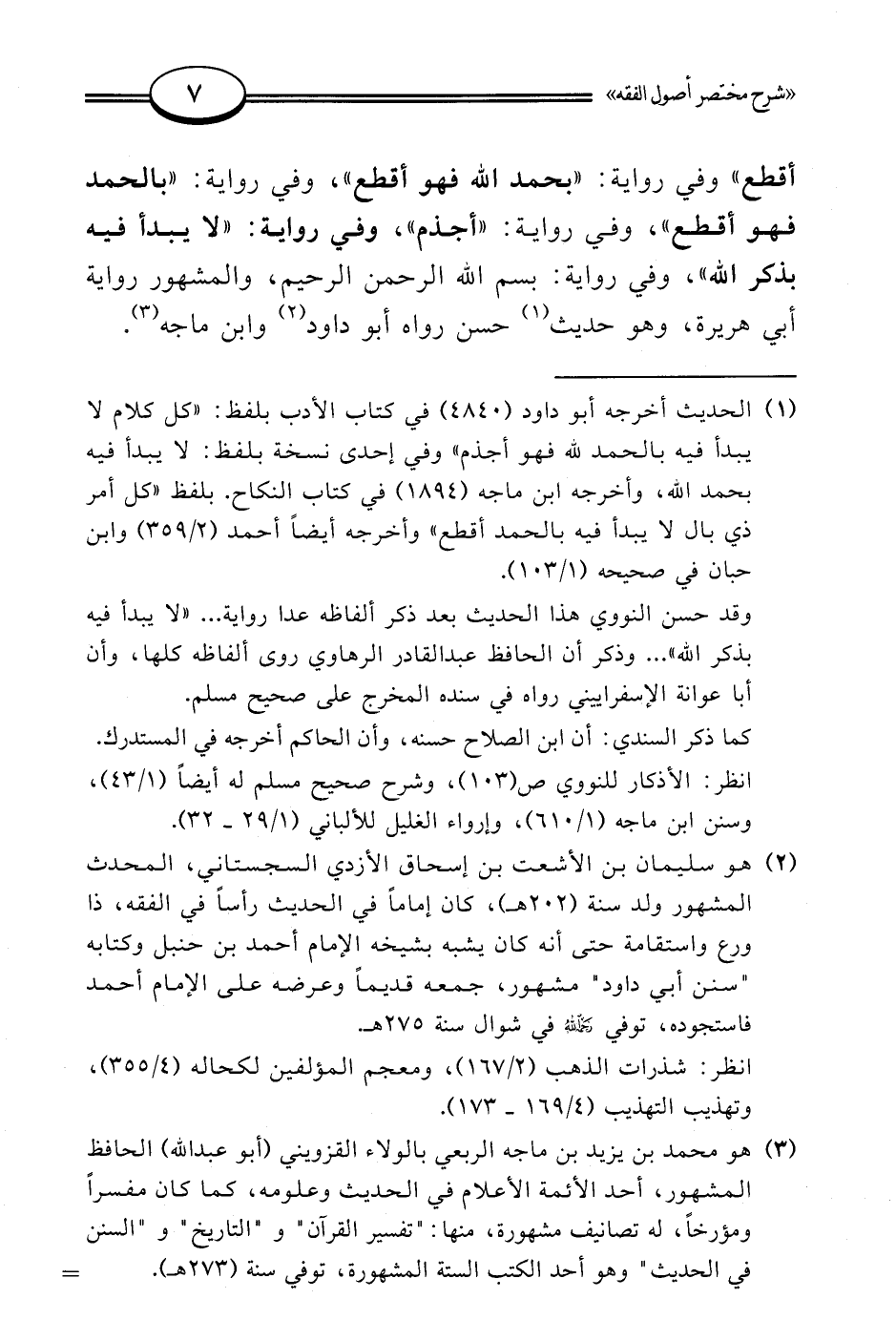 (¬1) الحديث أخرجه أبو داود (4840) في كتاب الأدب بلفظ: "كل كلام لا يبدأ فيه بالحمد لله فهو أجذم" وفي إحدى نسخة بلفظ: لا يبدأ فيه بحمد الله، وأخرجه ابن ماجه (1894) في كتاب النكاح. بلفظ "كل أمر ذي بال لا يبدأ فيه بالحمد أقطع" وأخرجه أيضًا أحمد (2/ 359) وابن حبان في صحيحه (1/ 103).