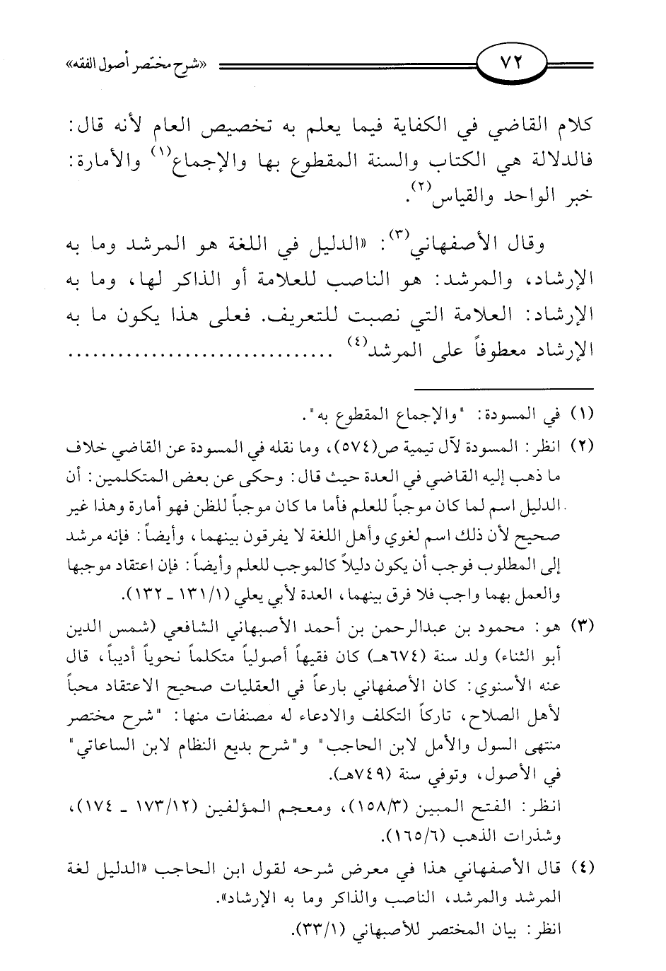 (¬4) قال الأصفهاني هذا في معرض شرحه لقول ابن الحاجب "الدليل لغة المرشد والمرشد، الناصب والذاكر وما به الإرشاد".