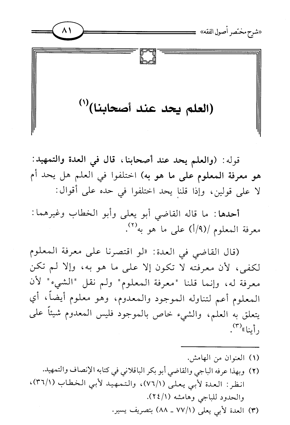 قوله: (والعلم يحد عند أصحابنا، قال في العدة والتمهيد: هو معرفة المعلوم على ما هو به) اختلفوا في العلم هل يحد أم لا على قولين، وإذا قلنا يحد اختلفوا في حده على أقوال: