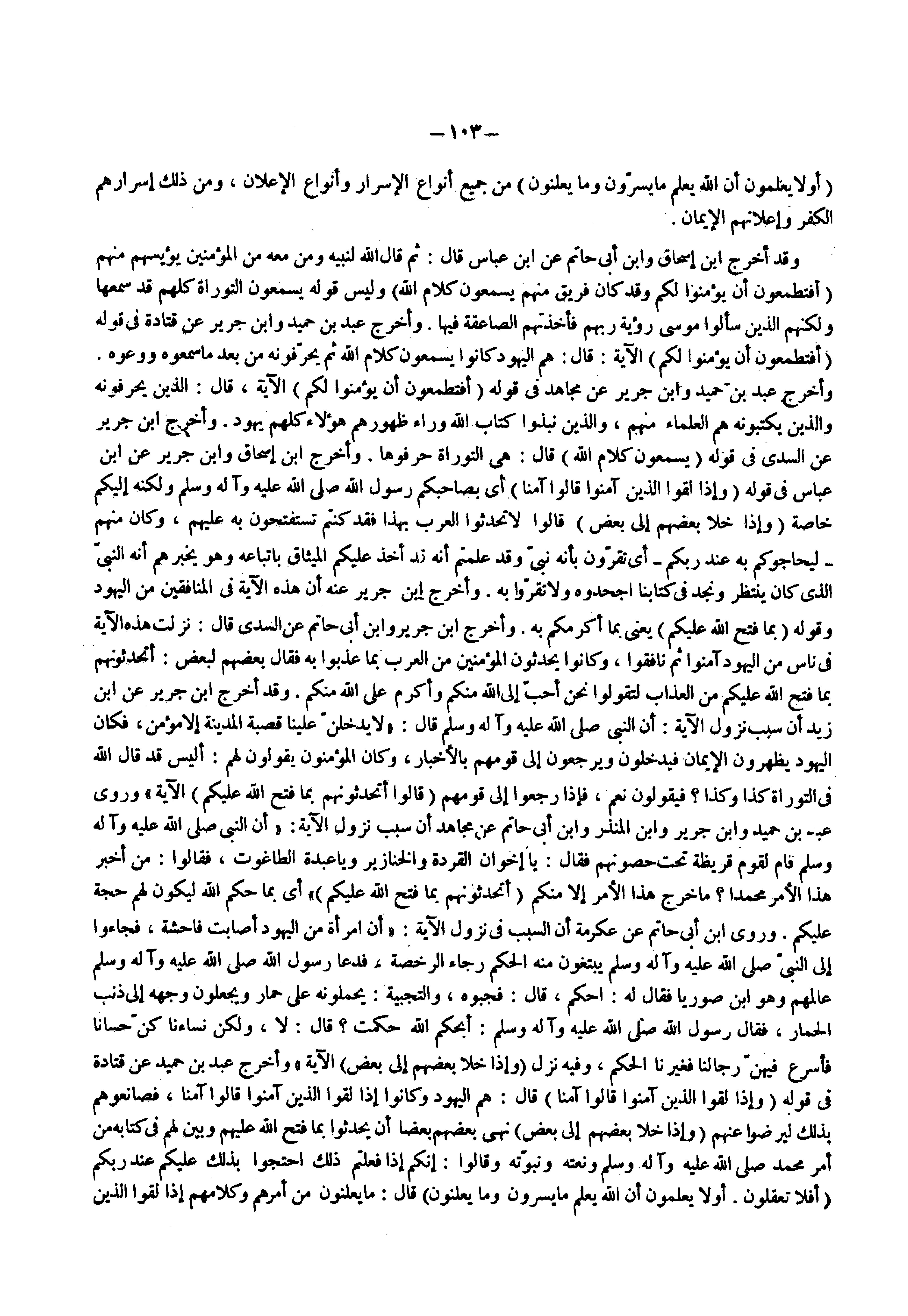وقد أخرج ابن إسحاق وابن أبي حاتم عن ابن عباس قال ثم قال الله لنبيه ومن معه من المؤمنين يؤيسهم منهم ) أفتطمعون أن يؤمنوا لكم وقد كان فريق منهم يسمعون كلام الله ( وليس قوله يسمعون التوراة كلهم قد سمعها ولكنهم الذين سألوا موسى رؤية ربهم فأخذتهم الصاعقة فيها وأخرج عبد بن حمبد وابن جرير عن قتادة في قوله ) أفتطمعون أن يؤمنوا لكم ( الآية قال هم اليهود كانوا يسمعون كلام الله ثم يحرفونه من بعد ما سمعوه ووعوه وأخرج عبد بن حميد وابن جرير عن مجاهد في قوله ) أفتطمعون أن يؤمنوا لكم ( الآية قال الذين يحرفونه والذين يكتبونه هم العلماء منهم والذين نبذوا كتاب الله وراء ظهورهم هؤلاء كلهم يهود وأخرج ابن جرير عن السدي في قوله ) يسمعون كلام الله ( قال هي التوراة حرفوها وأخرج ابن إسحاق وابن جرير عن ابن عباس في قوله ) وإذا لقوا الذين آمنوا قالوا آمنا ( أي بصاحبكم رسول الله ( صلى الله عليه وسلم ) ولكنه إليكم خاصة ) وإذا خلا بعضهم إلى بعض ( قالوا لا تحدثوا العرب بهذا فقد كنتم تستفتحون به عليهم وكان منهم ) ليحاجوكم به عند ربكم ( أي تقرون بأنه نبي وقد علمتم أنه قد أخذ عليكم الميثاق بإتباعه وهو يخبرهم أنه النبي الذي كان ينتظر ونجد في كتابنا اجحدوه ولا تقروا به وأخرج ابن جرير عنه أن هذه الآية في المنافقين من اليهود وقوله ) بما فتح الله عليكم ( يعني بما أكرمكم به واخرج ابن جرير وابن أبي حاتم عن السدي قال نزلت هذه الآية في ناس من اليهود آمنوا ثم نافقوا وكانوا يحدثون المؤمنين من العرب بما عذبوا به فقالوا بعضهم لبعض أتحدثونهم بما فتح الله عليكم من العذاب لتقولوا نحن أحب إلى الله منكم وأكرم على الله منكم وقد أخرج ابن جرير عن ابن زيد أن سبب نزول الآية أن النبي ( صلى الله عليه وسلم ) قال ( لا يدخلن علينا قصبة المدينة إلا مؤمن فكان اليهود يظهرون الإيمان فيدخلون ويرجعون إلى قومهم بالأخبار وكان المؤمنون يقولون لهم أليس قد قال الله في التوراة كذا وكذا فيقولون نعم فإذا رجعوا إلى قومهم ) قالوا أتحدثونهم بما فتح الله عليكم ( الآية ) وروى عبد بن حميد وابن جرير وابن المنذر وابن أبي حاتم عن مجاهد أن سبب نزول الآية ( أن النبي ( صلى الله عليه وسلم ) قام لقوم قريظة تحت حصونهم فقال يا إخوان القردة والخنازير ويا عبدة الطاغون فقالوا من أخبر هذا الأمر محمدا ما خرج هذا الأمر إلا منكم ) أتحدثونهم بما فتح الله عليكم ( أي بما حكم الله ليكون لهم حجة عليكم وروى ابن أبي حاتم عن عكرمة أن السبب في نزول الآية ( أن إمرأة من اليهود أصابت فاحشة فجاءوا إلى النبي ( صلى الله عليه وسلم ) يبتغون منه الحكم رجاء الرخصة فدعا رسول الله ( صلى الله عليه وسلم ) عالمهم وهو ابن صوريا فقال له احكم قال فجبوه والتجبية يحملونه على حمار ويجعلون وجهه إلى ذنب الحمار فقال رسول الله ( صلى الله عليه وسلم ) ابحكم الله حكمت قال لا ولكن نساءنا كن حسانا فأسرع فيهن رجالنا فغيرنا الحكم وفيه نزل ) وإذا خلا بعضهم إلى بعض ( الآية ) وأخرج عبد بن حميد عن قتادة في قوله ) وإذا لقوا الذين آمنوا قالوا آمنا ( قال هم اليهود وكانوا إذا لقوا الذين آمنوا قالوا آمنا فصانعوهم بذلك ليرضوا عنهم ) وإذا خلا بعضهم إلى بعض ( نهى بعضهم بعضا أن يحدثوا بما فتح الله عليهم وبين لهم في كتابه من أمر محمد ( صلى الله عليه وسلم ) ونعته ونبوته وقالوا إنكم إذا فعلتم ذلك احتجوا بذلك عليكم عند ربكم ) أفلا تعقلون أو لا يعلمون أن الله يعلم ما يسرون وما يعلنون ( قال ما يعلنون من أمرهم وكلامهم إذا لقوا الذين