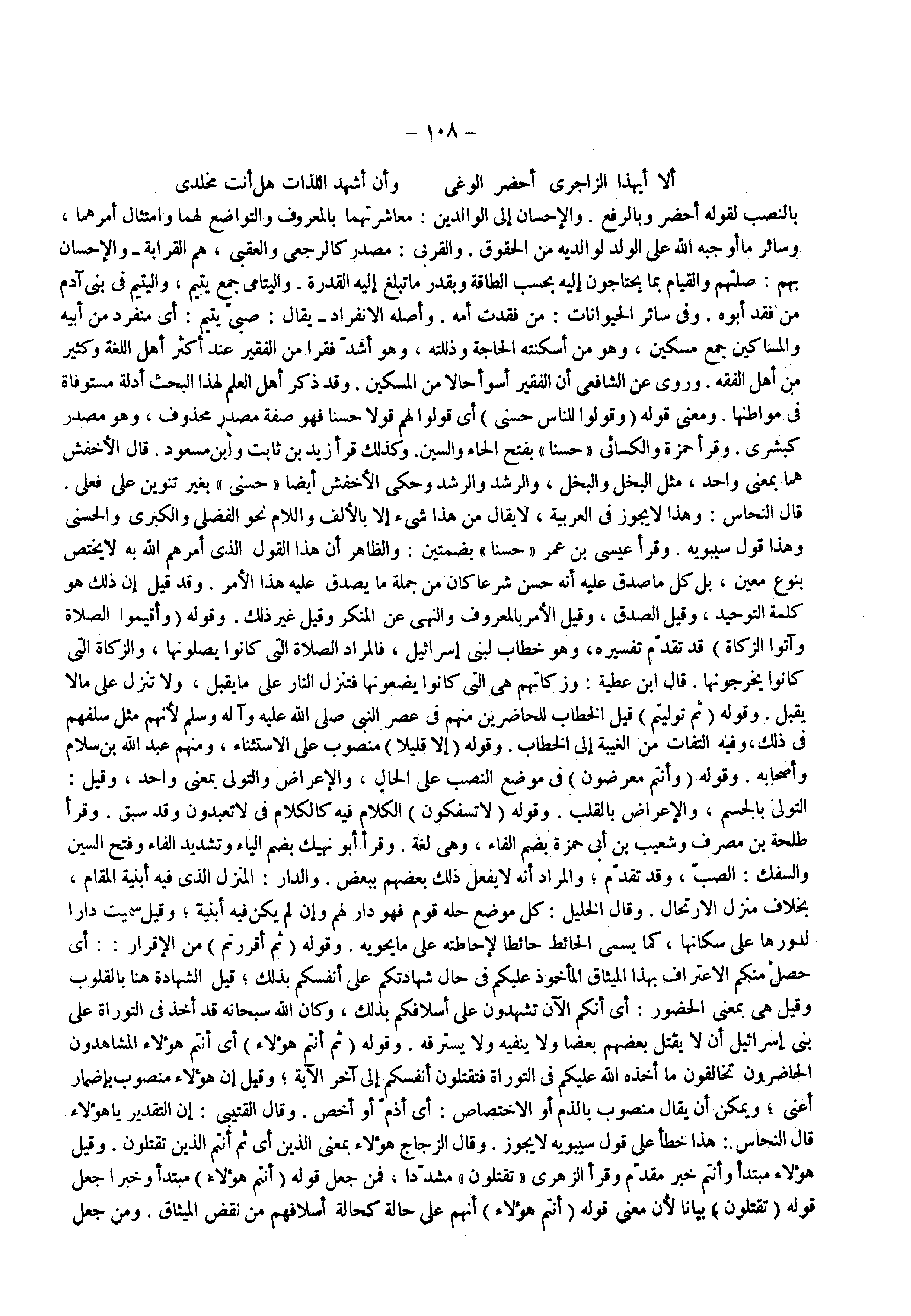 بالنصب لقوله أحضر وبالرفع والإحسان إلى الوالدين معاشرتهما بالمعروف والتواضع لهما وامتثال أمرهما وسائر ما أوجبه الله على الولد لوالديه من الحقوق والقربى مصدر كالرجعي والعقبى هم القرابة والإحسان بهم صلتهم والقيام بما يحتاجون إليه بحسب الطاقة وبقدر ما تبلغ إليه القدرة واليتامى جمع يتيم واليتيم في بني آدم من فقد أبوه وفي سائر الحيوانات من فقدت أمه وأصله الإنفراد يقال صبي يتيم أي منفرد من أبيه والمساكين جمع مسكين وهو من أسكنته الحاجة وذللته وهو أشد فقرا من الفقير عند أكثر أهل اللغة وكثير من أهل الفقه وروى عن الشافعي أن الفقير أسود أسوأ حالا من المسكين وقد ذكر أهل العلم لهذا البحث أدلة مستوفاة في مواطنها ومعنى قوله ) وقولوا للناس حسنا ( أي قولوا لهم قولا حسنا فهو صفة مصدر محذوف وهو مصدر كبشرى وقرأ حمزة والكسائي ( حسنا ) بفتح الحاء والسين وكذلك قرأ زيد بن ثابت وابن مسعود قال الأخفش هما بمعنى واحد مثل البخل والبخل والرشد والرشد وحكى الأخفش أيضا ( حسنى ) بغير تنوين على فعلى قال النحاس وهذا لا يجوز في العربية لا يقال من هذا شيء إلا بالألف واللام نحو الفضلى والكبرى والحسنى وهذا قول سيبويه وقرأ عيسى بن عمر ( حسنا ) بضمتين والظاهر أن هذا القول الذي أمرهم الله به لا يختص بنوع معين بل كل ما صدق عليه أنه حسن شرعا كان من جملة ما يصدق عليه هذا الأمر وقد قيل إن ذلك هو كلمة التوحيد وقيل الصدق وقيل الأمر بالمعروف والنهي عن المنكر وقيل غير ذلك وقوله ) وأقيموا الصلاة وآتوا الزكاة ( قد تقدم تفسيره وهو خطاب لبني إسرائيل فالمراد الصلاة التي كانوا يصلونها والزكاة التي كانوا يخرجونها قال ابن عطية وزكاتهم هي التي كانوا يضعونها فتنزل النار على ما يقبل ولا تنزل على ما لا يقبل وقوله ( ثم توليتم ) قيل الخطاب للحاضرين منهم في عصر النبي ( صلى الله عليه وسلم ) لأنهم مثل سلفهم في ذلك وفيه التفات من الغيبة إلى الخطاب وقوله ( إلا قليلا ) منصوب على الاستثناء ومنهم عبدالله بن سلام وأصحابه وقوله ) وأنتم معرضون ( في موضع النصب على الحال والإعراض والتولي بمعنى واحد وقيل التولي بالجسم والإعراض بالقلب
