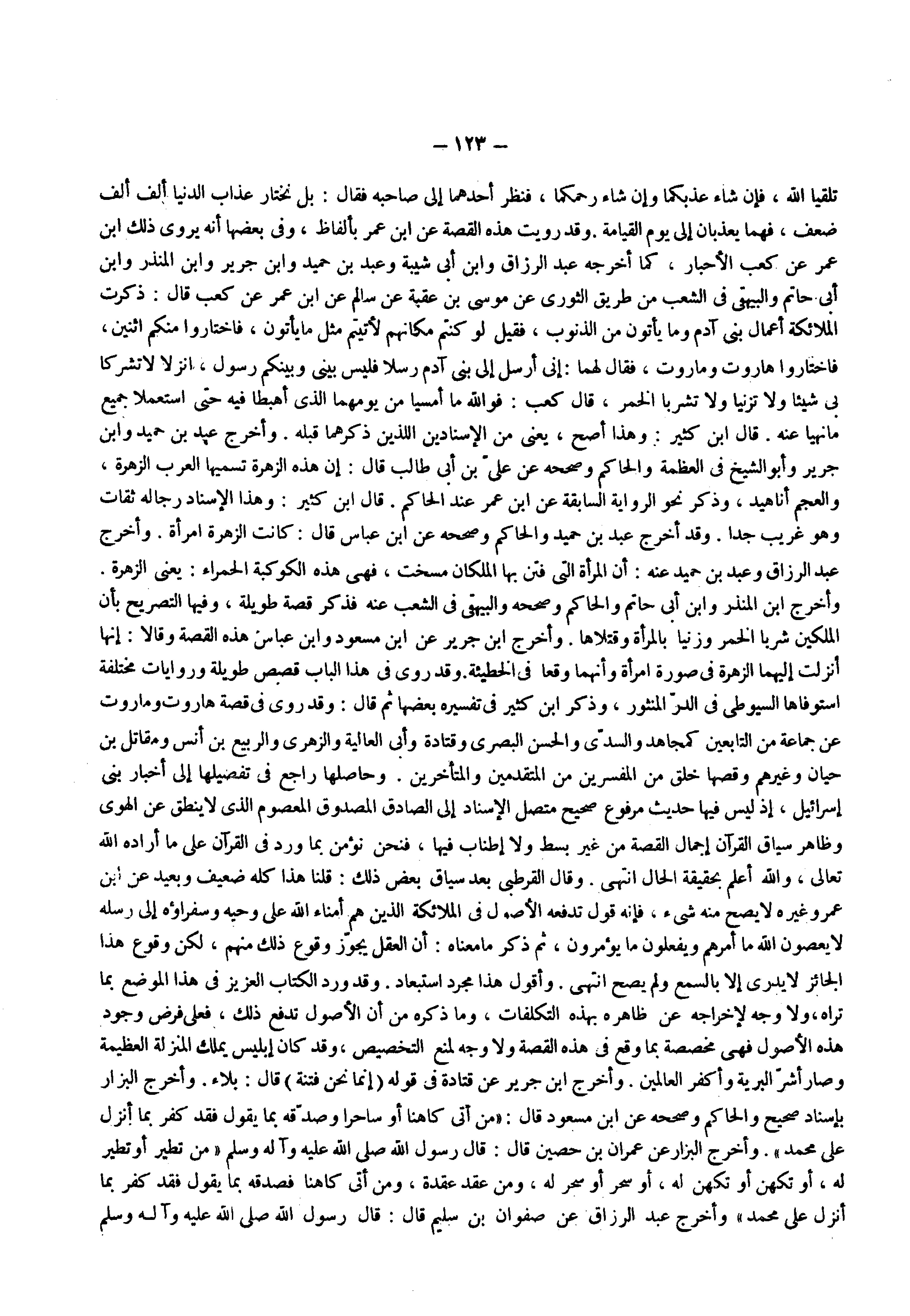 تلقيا الله فإن شاء عذبكما وإن شاء رحمكما فنظر أحدهما إلى صاحبه فقال بل نختار عذاب الدنيا ألف ألف ضعف فهما يعذبان إلى يوم القيامة وقد رويت هذه القصة عن ابن عمر بألفاظ وفي بعضها أنه يروي ذلك ابن عمر عن كعب الأحبار كما أخرجه عبدالرزاق وابن أبي شيبة وعبد بن حميد وابن جرير وابن المنذر وابن أبي حاتم والبيهقي في الشعب من طريق الثوري عن موسى بن عقبة عن سالم عن ابن عمر عن كعب قال ذكرت الملائكة أعمال بني آدم وما يأتون من الذنوب فقيل لو كنتم مكانهم لأتيتم مثل ما يأتون فاختاروا منكم اثنين فاختاروا هاروت وماروت فقال لهما إني أرسل إلى بني آدم رسلا فليس بيني وبينكم رسول انزلا لا تشركا بي شيئا ولا تزنيا ولا تشربا الخمر قال كعب فوالله ما أمسيا من يومهما الذي أهبطا فيه حتى استعملا جميع ما نهيا عنه قال ابن كثير وهذا أصح يعني من الإسنادين اللذين ذكرهما قبله وأخرج عبد بن حميد وابن جرير وأبو الشيخ في العظمة والحاكم وصححه عن علي بن أبي طالب قال إن هذه الزهرة تسميها العرب الزهرة والعجم أناهيد وذكر نحو الرواية السابقة عن ابن عمر عند الحاكم قال ابن كثير وهذا الإسناد رجاله ثقات وهو غريب جدا وقد أخرج عبد بن حميد والحاكم وصححه عن ابن عباس قال كانت الزهرة امرأة واخرج عبد الرزاق وعبد بن حميد عنه أن المرأة التي فتن بها الملكان مسخت فهي هذه الكوكبة الحمراء يعني الزهرة