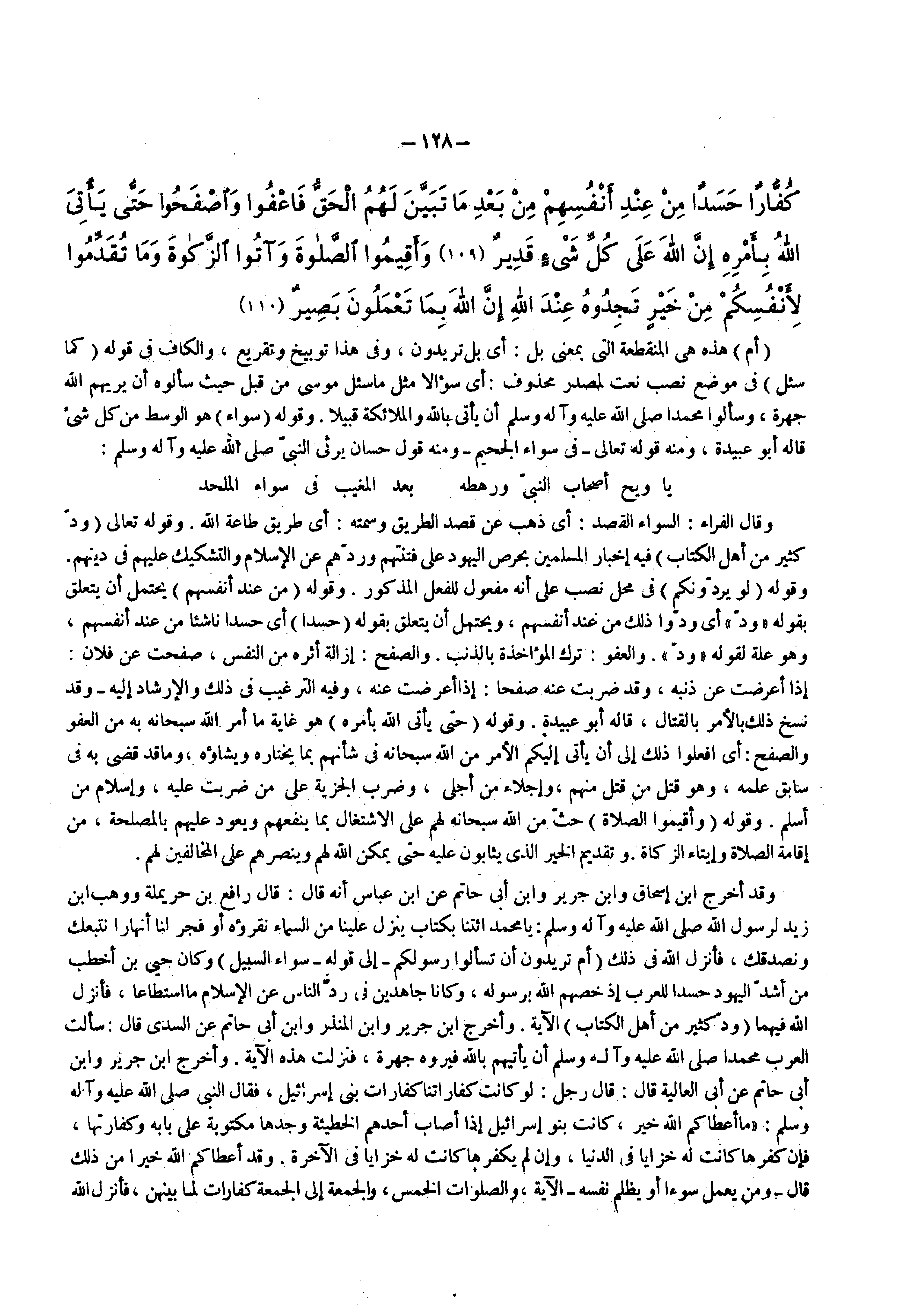 وقد أخرج ابن إسحاق وابن جرير وابن أبي حاتم عن ابن عباس أنه قال قال رافع بن حريملة ووهب ابن زيد لرسول الله ( صلى الله عليه وسلم ) يا محمد ائتنا بكتاب ينزل علينا من السماء نقرؤه أو فجر لنا أنهارا نتبعك ونصدقك فأنزل الله في ذلك ) أم تريدون أن تسألوا رسولكم ( إلى قوله ) سواء السبيل ( وكان حيي بن أخطب من أشد اليهود حسدا للعرب إذ خصهم الله برسوله وكانا جاهدين في رد الناس عن الإسلام ما استطاعا فأنزل الله فيهما ) ود كثير من أهل الكتاب ( الآية وأخرج ابن جرير وابن المنذر وابن أبي حاتم عن السدي قال سألت العرب محمدا ( صلى الله عليه وسلم ) أن يأتيهم بالله فيروه جهرة فنزلت هذه الآية وأخرج ابن جرير وابن أبي حاتم عن أبي العالية قال قال رجل لو كانت كفاراتنا كفارات بني إسرائيل فقال النبي ( صلى الله عليه وسلم ) ( ما أعطاكم الله خير كانت بنو إسرائيل إذا أصاب أحدهم الخطيئة وجدها مكتوبة على بابه وكفارتها فإن كفرها كانت له خزايا في الدنيا وإن لم يكفرها كانت له خزايا في الآخرة وقد أعطاكم الله خيرا من ذلك قال ) ومن يعمل سوءا أو يظلم نفسه ( الآية والصلوات الخمس والجمعة إلى الجمعة كفارات لما بينهن فأنزل الله
