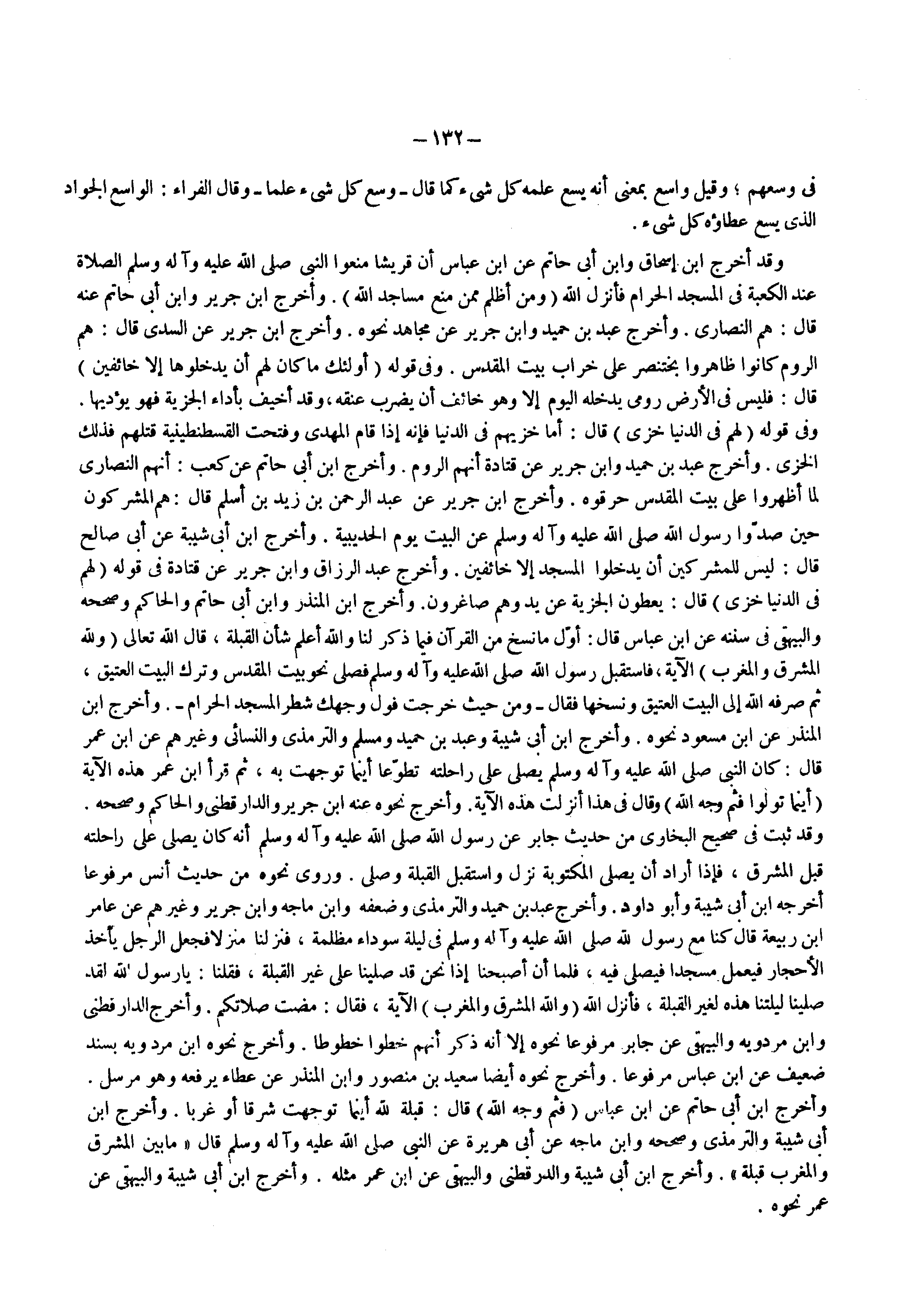 وقد أخرج ابن إسحاق وابن أبي حاتم عن ابن عباس أن قريشا منعوا النبي ( صلى الله عليه وسلم ) الصلاة عند الكعبة في المسجد الحرام فأنزل الله ) ومن أظلم ممن منع مساجد الله ( وأخرج ابن جرير وابن أبي حاتم عنه قال هم النصارى وأخرج عبد بن حميد وابن جرير عن مجاهد نحوه وأخرج ابن جرير عن السدي قال هم الروم كانوا ظاهروا بختنصر على خراب بيت المقدس وفي قوله ) أولئك ما كان لهم أن يدخلوها إلا خائفين ( قال فليس في الأرض رومي يدخله اليوم إلا وهو خائف أن يضرب عنقه وقد أخيف بأداء الجزية فهو يؤديها وفي قوله ) لهم في الدنيا خزي ( قال أما خزيهم في الدنيا فإنه إذا قام المهدي وفتحت القسطنطينية قتلهم فذلك الخزي وأخرج عبد بن حميد وابن جرير عن قتادة أنهم الروم وأخرج ابن أبي حاتم عن كعب أنهم النصارى لما أظهروا على بيت المقدس حرقوه وأخرج ابن جرير عن عبدالرحمن بن زيد بن أسلم قال هم المشركون حين صدوا رسول الله ( صلى الله عليه وسلم ) عن البيت يوم الحديبية وأخرج ابن أبي شيبة عن أبي صالح قال ليس للمشركين أن يدخلوا المسجد إلا خائفين وأخرج عبدالرزاق وابن جرير عن قتادة في قوله ) لهم في الدنيا خزي ( قال يعطون الجزية عن يد وهم صاغرون وأخرج ابن المنذر وابن أبي حاتم والحاكم وصححه والبيهقي في سننه عن ابن عباس قال أول ما نسخ من القرآن فيما ذكر لنا والله أعلم شأن القبلة قال الله تعالى ) ولله المشرق والمغرب ( الآية فاستقبل رسول الله ( صلى الله عليه وسلم ) فصلى نحو بيت المقدس وترك البيت العتيق ثم صرفه الله إلى البيت العتيق ونسخها فقال ) ومن حيث خرجت فول وجهك شطر المسجد الحرام ( وأخرج ابن المنذر عن ابن مسعود نحوه وأخرج ابن أبي شيبة وعبد بن حميد ومسلم والترمذي والنسائي وغيرهم عن ابن عمر قال كان النبي ( صلى الله عليه وسلم ) يصلي على راحلته تطوعا أينما توجهت به ثم قرأ ابن عمر هذه الآية ) فأينما تولوا فثم وجه الله ( وقال في هذا أنزلت هذه الآية وأخرج نحوه عنه ابن جرير والدارقطني والحاكم وصححه وقد ثبت في صحيح البخاري من حديث جابر عن رسول الله ( صلى الله عليه وسلم ) أنه كان يصلي على راحلته قبل المشرق فإذا أراد أن يصلي المكتوبة نزل واستقبل القبلة وصلى وروى نحوه من حديث أنس مرفوعا أخرجه ابن أبي شيبة وأبو داود وأخرج عبد بن حميد والترمذي وضعفه وابن ماجة وابن جرير وغيرهم عن عامر ابن ربيعة قال كنا مع رسول الله ( صلى الله عليه وسلم ) في ليلة سوداء مظلمة فنزلنا منزلا فجعل الرجل يأخذ الأحجار فيعمل مسجدا فيصلي فيه فلما أن أصبحنا إذا نحن قد صلينا على غير القبلة فقلنا يا رسول الله لقد صلينا ليلتنا هذه لغير القبلة فأنزل الله ) ولله المشرق والمغرب ( الآية فقال مضت صلاتكم وأخرج الدارقطني وابن مردويه والبيهقي عن جابر مرفوعا نحوه إلا أنه ذكر أنهم خطوا خطوطا وأخرج نحوه ابن مردويه بسند ضعيف عن ابن عباس مرفوعا وأخرج نحوه أيضا سعيد بن منصور وابن المنذر عن عطاء يرفعه وهو مرسل وأخرج ابن أبي حاتم عن ابن عباس ) فثم وجه الله ( قال قبلة الله اينما توجهت شرقا أو غربا وأخرج ابن أبي شيبة والترمذي وصححه وابن ماجة عن أبي هريرة عن النبي ( صلى الله عليه وسلم ) قال ( ما بين المشرق والمغرب قبلة ) وأخرج ابن أبي شيبة والدارقطني والبيهقي عن ابن عمر مثله وأخرج ابن أبي شيبة والبيهقي عن عمر نحوه