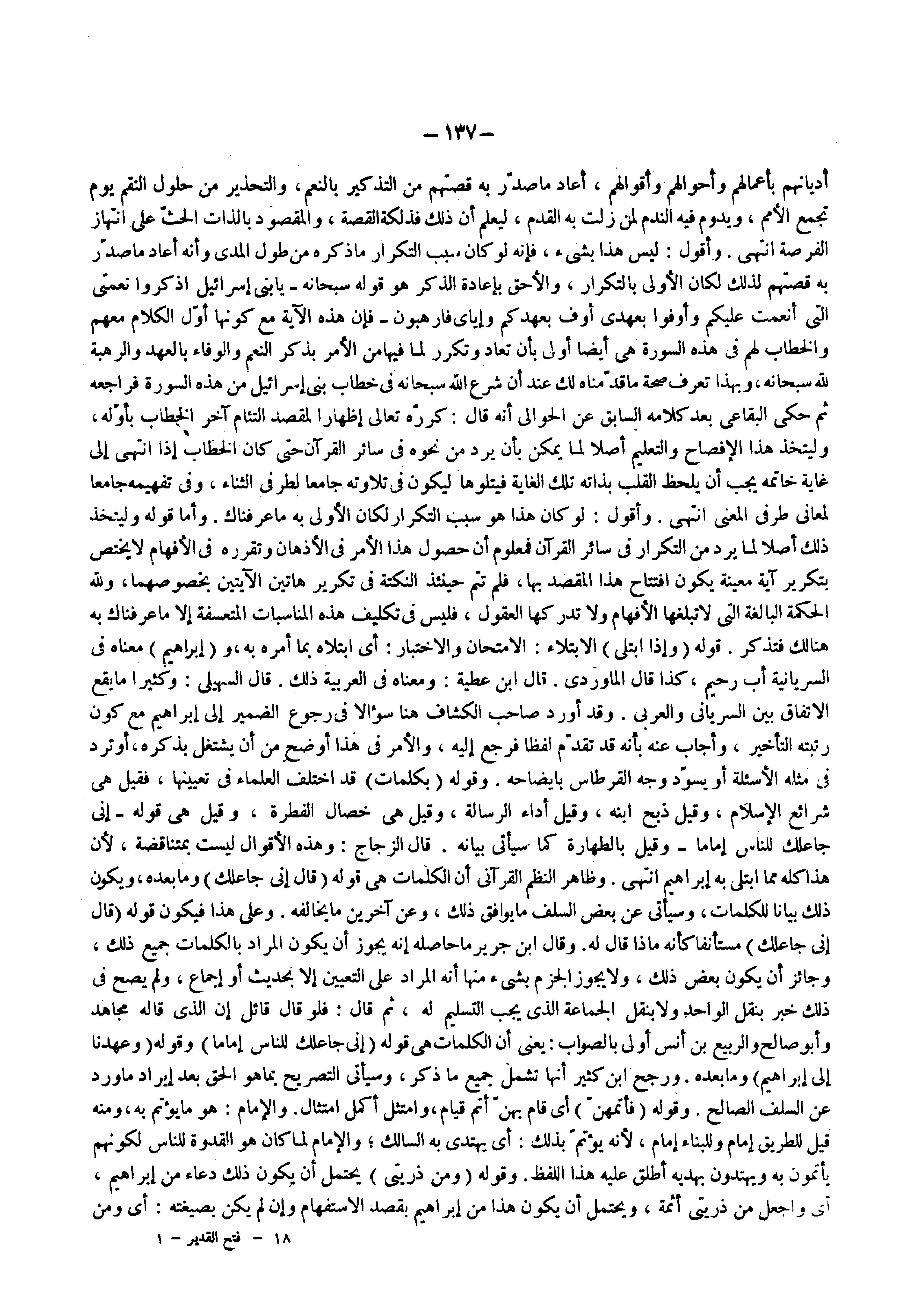 قوله ( وإذ ابتلى ) الإبتلاء الإمتحان والاختبار أي ابتلاه بما أمره به و ( إبراهيم ) معناه في السريانية أب رحيم كذا قال الماوردي قال ابن عطية ومعناه في العربية كذلك قال السهيلي وكثيرا ما يقع الإتفاق بين السرياني والعربي وقد أورد صاحب الكشاف هنا سؤالا في رجوع الضمير إلى إبراهيم مع كون رتبته التأخير وأجاب عنه بأنه قد تقدم لفظا فرجع إليه والأمر في هذا أوضح من أن يشتغل بذكره أو ترد في مثله الأسئلة أو يسود وجه القرطاس بإيضاحه وقوله ( بكلمات ) قد اختلف العلماء في تعيينها فقيل هي شرائع الإسلام وقيل ذبح ابنه وقيل أداء الرسالة وقيل هي خصال الفطرة وقيل هي قوله ) إني جاعلك للناس إماما ( وقيل بالطهارة كما سيأتي بيانه قال الزجاج وهذه الأقوال ليس بمتناقضة لأن هذا كله مما ابتلى به إبراهيم انتهى وظاهر النظم القرآني أن الكلمات هي قوله ) قال إني جاعلك ( وما بعده ويكون ذلك بيانا للكلمات وسيأتي عن بعض السلف ما يوافق ذلك وعن آخرين ما يخالفه وعلى هذا فيكون قوله ) قال إني جاعلك ( مستأنفا كأنه ماذا قال له وقال ابن جرير ما حاصله إنه يجوز أن يكون المراد بالكلمات جميع ذلك وجائز أن يكون بعض ذلك ولا يجوز الجزم بشيء منها أنه المراد على التعيين إلا بحديث أو إجماع ولم يصح في ذلك خبر بنقل الواحد ولا بنقل الجماعة الذي يجب التسليم له ثم قال فلو قال قائل إن الذي قاله مجاهد وأبو صالح والربيع بن أنس أولى بالصواب يعني أن الكلمات هي قوله ) إني جاعلك للناس إماما ( وقوله ) وعهدنا إلى إبراهيم ( وما بعده ورجح ابن كثير أنها تشمل جميع ما ذكر وسيأتي التصريح بما هو الحق بعد إيراد ما ورد عن السلف الصالح وقوله ) فأتمهن ( أي قام بهن أتم قيام وامتثل أكمل امتثال والإمام هو ما يؤتم به ومنه قيل للطريق إمام وللبناء إمام لأنه يؤتم بذلك أي يهتدي به السالك والإمام لما كان هو القدوة للناس لكونهم يأتمون به ويهتدون بهديه أطلق عليه هذا اللفظ وقوله ) ومن ذريتي ( يحتمل أن يكون ذلك دعاء من إبراهيم أي واجعل من ذريتي أئمة ويحتمل أن يكون هذا من إبراهيم بقصد الاستفهام وإن لم يكن بصيغته أي ومن
