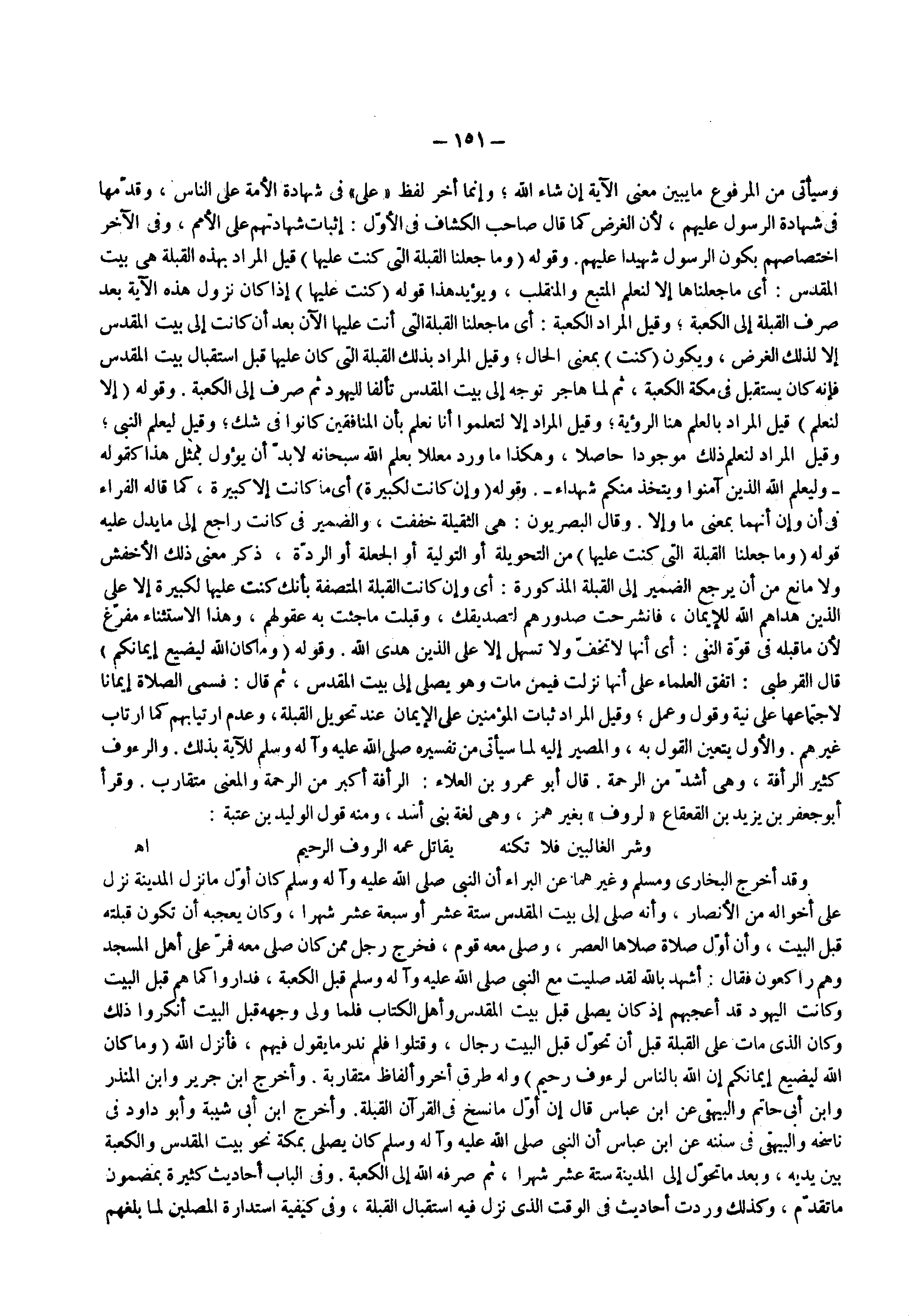 وسيأتي من المرفوع ما يبين معنى الآية إن شاء الله وإنما أخر لفظ ( على ) في شهادة الأمة على الناس وقدمها في شهادة الرسول عليهم لأن الغرض كما قال صاحب الكشاف في الأول إثبات شهادتهم على الأمم وفي الآخر اختصاصهم بكون الرسول شهيدا عليهم وقوله ) وما جعلنا القبلة التي كنت عليها ( قيل المراد بهذه القبلة هي بيت المقدس أي ما جعلناها إلا لنعلم المتبع والمنقلب ويؤيد هذا قوله ) كنت عليها ( إذا كان نزول هذه الآية بعد صرف القبلة إلى الكعبة وقيل المراد الكعبة أي ما جعلنا القبلة التي أنت عليها الآن بعد أن كانت إلى بيت المقدس إلا لذلك الغرض ويكون ( كنت ) بمعنى الحال وقيل المراد بذلك القبلة التي كان عليها قبل استقبال بيت المقدس فإنه كان يستقبل في مكة الكعبة ثم لما هاجر توجه إلى بيت المقدس تألفا لليهود ثم صرف إلى الكعبة وقوله ) إلا لنعلم ( قيل المراد بالعلم هنا الرؤية وقيل المراد إلا لتعلموا أنا نعلم بأن المنافقين كانوا في شك وقيل ليعلم النبي وقيل المراد لنعلم ذلك موجودا حاصلا وهكذا ما ورد معللا بعلم الله سبحانه لا بد أن يؤول بمثل هذا كقوله ) وليعلم الله الذين آمنوا ويتخذ منكم شهداء ( وقوله ) وإن كانت لكبيرة ( أي ما كانت إلا كبيرة كما قاله الفراء في أن وإن أنهما بمعنى ما وإلا وقال البصريون هي الثقيلة خففت والضمير في كانت راجع إلى ما يدل عليه قوله ) وما جعلنا القبلة التي كنت عليها ( من التحويلة أو التولية أو الجعلة أو الردة ذكر معنى ذلك الأخفش ولا مانع من أن يرجع الضمير إلى القبلة المذكورة أي وإن كانت القبلة المتصفة بأنك كنت عليها لكبيرة إلا على الذين هداهم الله للإيمان فانشرحت صدورهم لتصديقك وقبلت ما جئت به عقولهم وهذا الاستثناء مفرغ لأن ما قبله في قوة النفي أي أنها لا تخف ولا تسهل إلا على الذين هدى الله وقوله ) وما كان الله ليضيع إيمانكم ( قال القرطبي اتفق العلماء على أنها نزلت فيمن مات وهو يصلي إلى بيت المقدس ثم قال فسمى الصلاة إيمانا لاجتماعها على نية وقول وعمل وقيل المراد ثبات المؤمنين على الإيمان عند تحويل القبلة وعدم ارتيابهم كما ارتاب غيرهم والأول يتعين القول به والمصير إليه لما سيأتي من تفسيره ( صلى الله عليه وسلم ) للآية بذلك والرءوف كثير الرأفة وهي أشد من الرحمة قال أبو عمرو بن العلاء الرافة أكبر من الرحمة والمعنى متقارب وقرأ أبو جعفر بن يزيد بن القعقاع ( لروف ) بغير همز وهي لغة بني أسد ومنه قول الوليد بن عتبة وشر الغالبين فلا تكنه