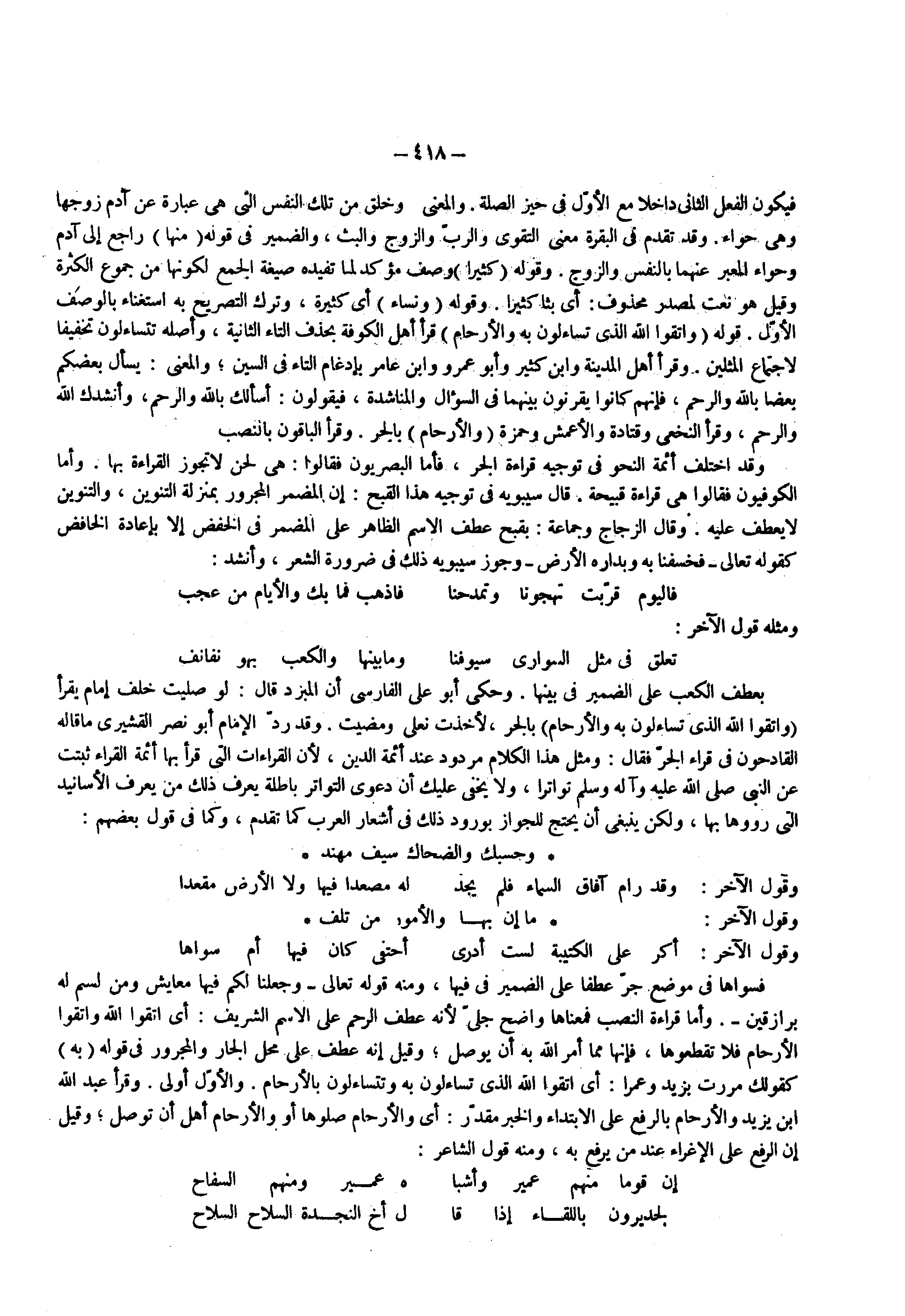 بعطف الكعب على الضمير في بينها وحكى أبو علي الفارسي إن المبرد قال لو صليت خلف إمام يقرا ( واتقوا الله الذي تساءلون به والأرحام ) بالجر لأخذت نعلى ومضيت وقد رد الإمام أبو نصر القشيرى ما قاله القادحون في قراء الجر فقال ومثل هذا الكلام مردود عند أئمة الدين لأن القراءات التي قرأ بها أئمة القراء ثبتت عن النبي ( صلى الله عليه وسلم ) تواترا ولا يخفي عليك إن دعوى التواتر باطلة يعرف ذلك من يعرف الأسانيد التي رووها بها ولكن ينبغي إن يحتج للجواز بورود ذلك في اشعار العرب كما تقدم وكما في قول بعضهم وحسبك والضحاك سيف مهند