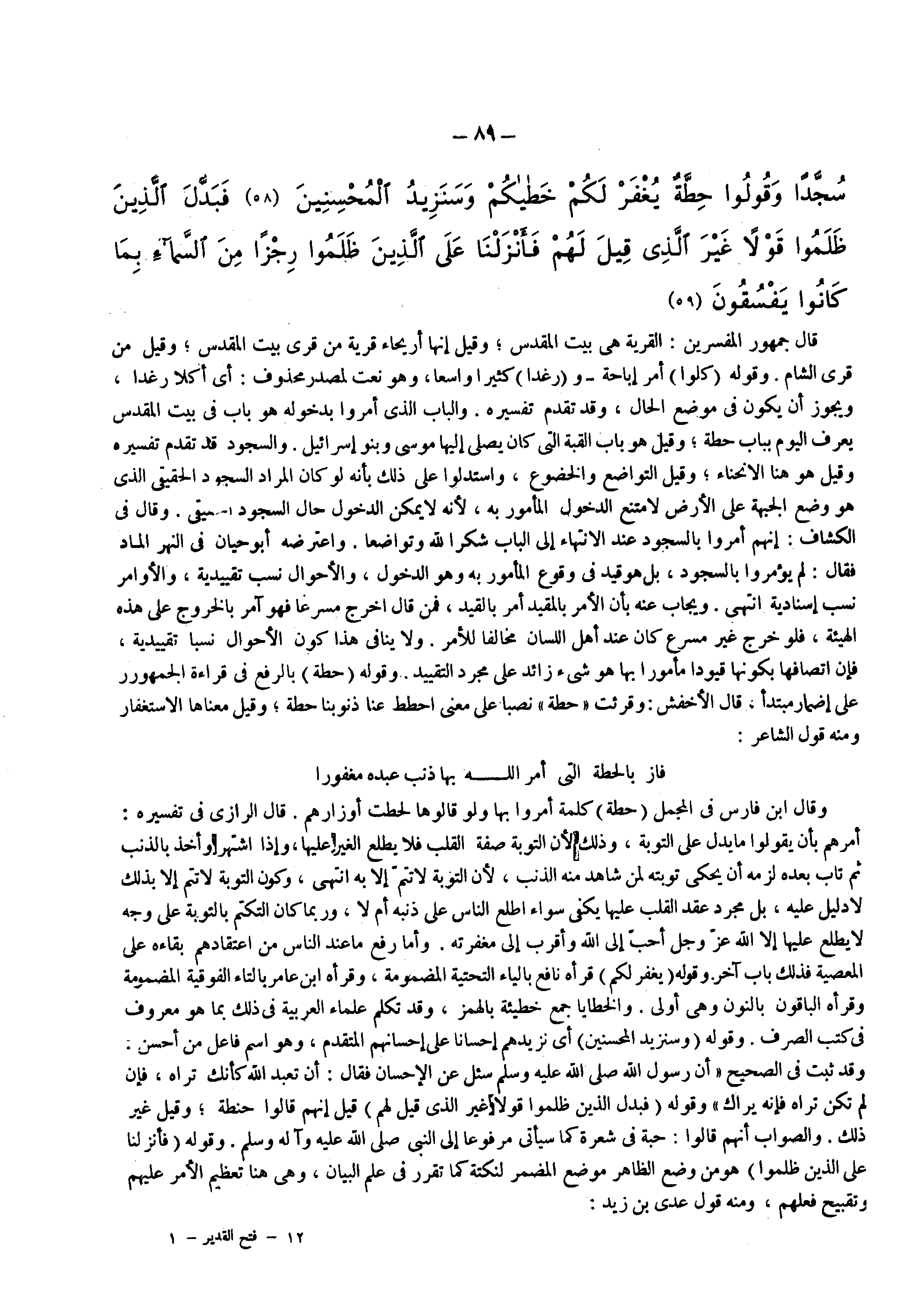 قال جمهور المفسرين القرية هي بيت المقدس وقيل إنها أريحاء قرية من قرى بيت المقدس وقيل من قرى الشام وقوله ) كلوا ( أمر إباحة و ) رغدا ( كثيرا واسعا وهو نعت لمصدر محذوف أي أكلا رغدا ويجوز أن يكون في موضع الحال وقد تقدم تفسيره والباب الذي أمروا بدخوله هو باب في بيت المقدس يعرف اليوم بباب حطة وقيل هو باب القبة التي كان يصلي إليها موسى وبنو إسرائيل والسجود قد تقدم تفسيره وقيل هو هنا الانحناء وقيل التواضع والخضوع واستدلوا على ذلك بأنه لو كان المراد السجود الحقيقي الذي هو وضع الجبهة على الأرض لامتنع الدخول المأمور به لأنه لا يمكن الدخول حال السجود الحقيقي وقال في الكشاف إنهم أمروا بالسجود عند الانتهاء إلى الباب شكرا لله وتواضعا واعترضه أبو حيان في النهر الماد فقال لم يؤمروا بالسجود بل هو قيد في وقوع المأمور به وهو الدخول والأحوال نسب تقييدية والأوامر نسب إسنادية انتهى ويجاب عنه بأن الأمر بالمقيد أمر بالقيد فمن قال أخرج مسرعا فهو ى مر بالخروج على هذه الهيئة فلو خرج غير مسرع كان عند أهل اللسان مخالفا للأمر ولا ينافي هذا كون الأحوال نسبا تقييدية فإن اتصافها بكونها قيودا مأمورا بها هو شيء زائد على مجرد التقييد وقوله ) حطة ( بالرفع في قراءة الجمهور على إضمار مبتدا قال الأخفش وقرئت ( حطة ) نصبا على معنى احطط عنا ذنوبنا حطة وقيل معناها الاستغفار ومنه قول الشاعر فاز بالحطة التي أمر الله بها ذنب عبده مغفورا