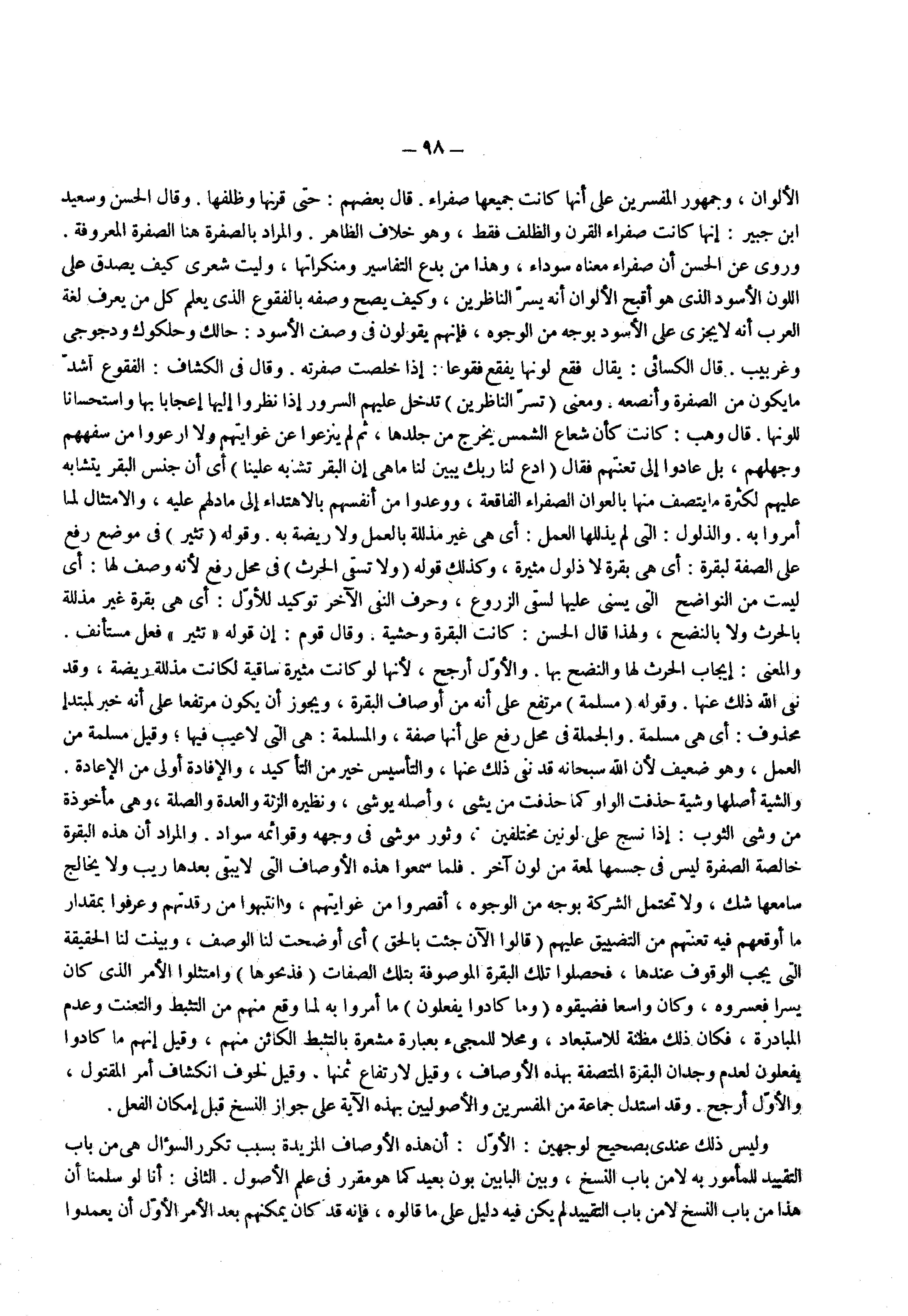 الألوان وجمهور المفسرين على أنها كانت جميعها صفراء قال بعضهم حتى قرنها وظلفها وقال الحسن وسعيد ابن جبير إنها كانت صفراء القرن والظلف فقط وهو خلاف الظاهر والمراد بالصفرة هنا الصفرة المعروفة