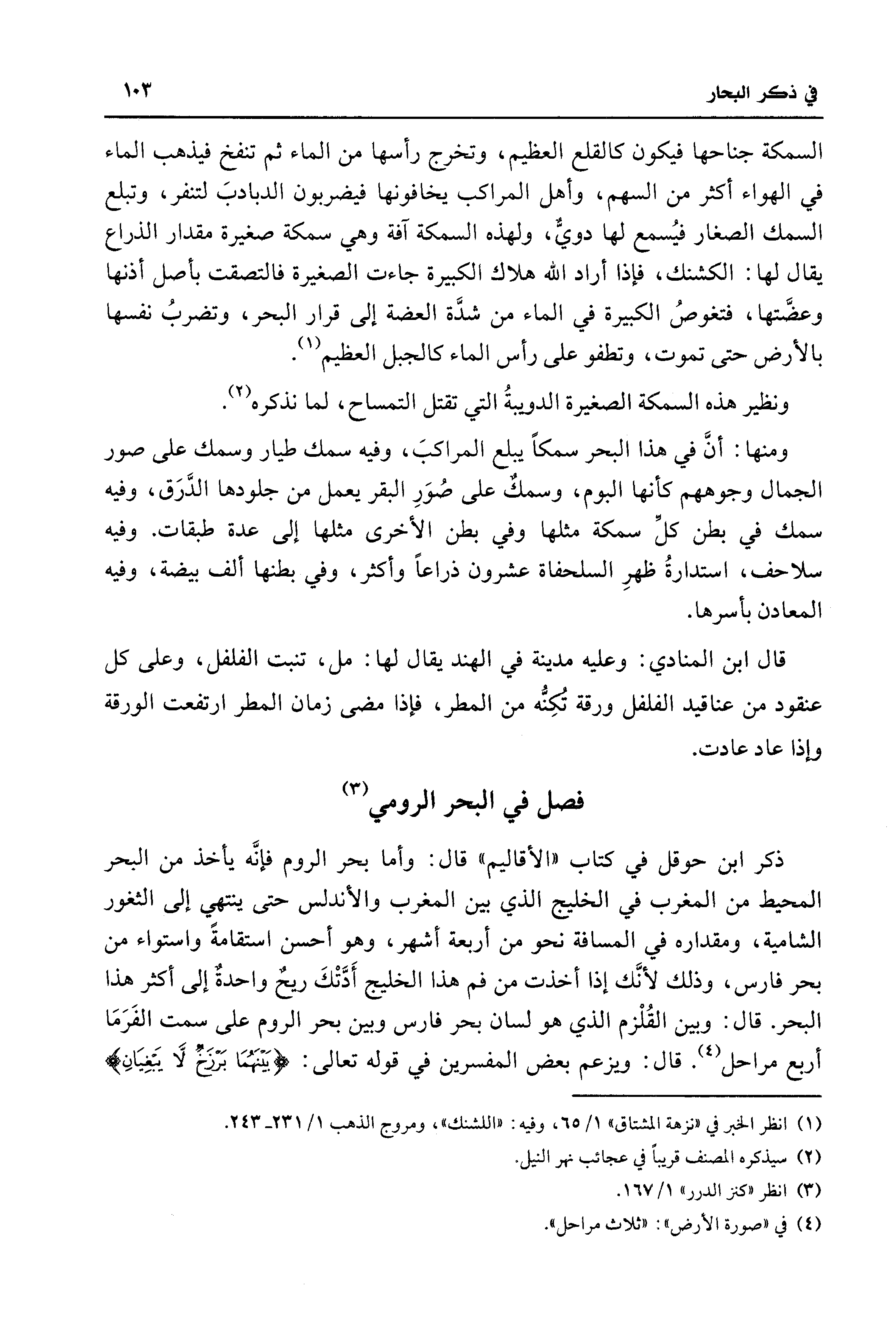 ذكر ابن حوقل في كتاب "الأقاليم" قال: وأما بحر الروم فإنَّه يأخذ من البحر المحيط من المغرب في الخليج الذي بين المغرب والأندلس حتى ينتهي إلى الثغور الشامية، ومقداره في المسافة نحو من أربعة أشهر، وهو أحسن استقامةً واستواء من بحو فارس، وذلك لأنَّك إذا أخذت من فم هذا الخليج أَدَّتْكَ ريحٌ واحدةٌ إلى أكثر هذا البحر. قال: وبين القُلْزم الذي هو لسان بحر فارس وبين بحو الروم على سمت الفَرَمَا أربع مراحل (¬4). قال: ويزعم بعض المفسرين في قوله تعالى: {بَينَهُمَا بَرْزَخٌ لَا يَبْغِيَانِ (20)}