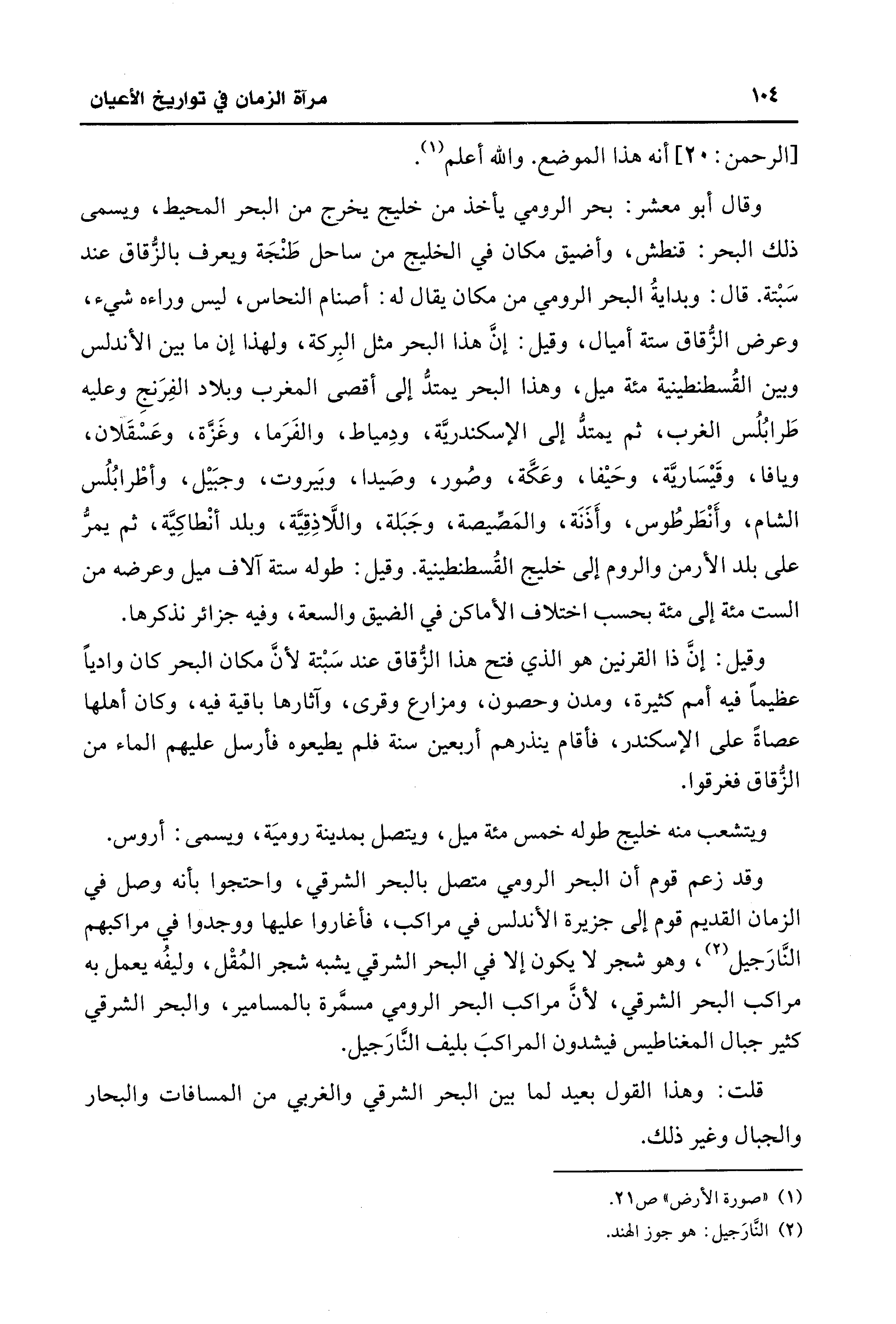 وقال أبو معشر: بحر الرومي يأخذ من خليج يخرج من البحر المحيط، ويسمى ذلك البحر: قنطش، وأضيق مكان في الخليج من ساحل طَنْجَة ويعرف بالزُّقاق عند سَبْتة. قال: وبدايةُ البحر الرومي من مكان يقال له: أصنام النحاس، ليس وراءه شيء، وعرض الزُّقاق ستة أميال، وقيل: إنَّ هذا البحر مثل البِركة، ولهذا إن ما بين الأندلس وبين القُسطنطينية مئة ميل، وهذا البحر يمتدُّ إلى أقصى المغرب وبلاد الفِرَنجِ وعليه طَرابُلُس الغرب، ثم يمتدُّ إلى الإسكندريَّة، ودِمياط، والفَرَما، وغَزَّة، وعَسْقَلان، ويافا، وقَيسَاريَّة، وحَيفا، وعَكَّة، وصُور، وصَيدا، وبَيروت، وجبَيْل، وأطْرابُلُس الشام، وأَنْطَرطُوس، وأَذَنَة، والمَصِّيصة، وجَبَلة، واللَّاذِقِيَّة، وبلد أنْطاكِيَّة، ثم يمرُّ على بلد الأرمن والروم إلى خليج القُسطنطينية. وقيل: طوله ستة آلاف ميل وعرضه من الست مئة إلى مئة بحسب اختلاف الأماكن في الضيق والسعة، وفيه جزائر نذكرها.