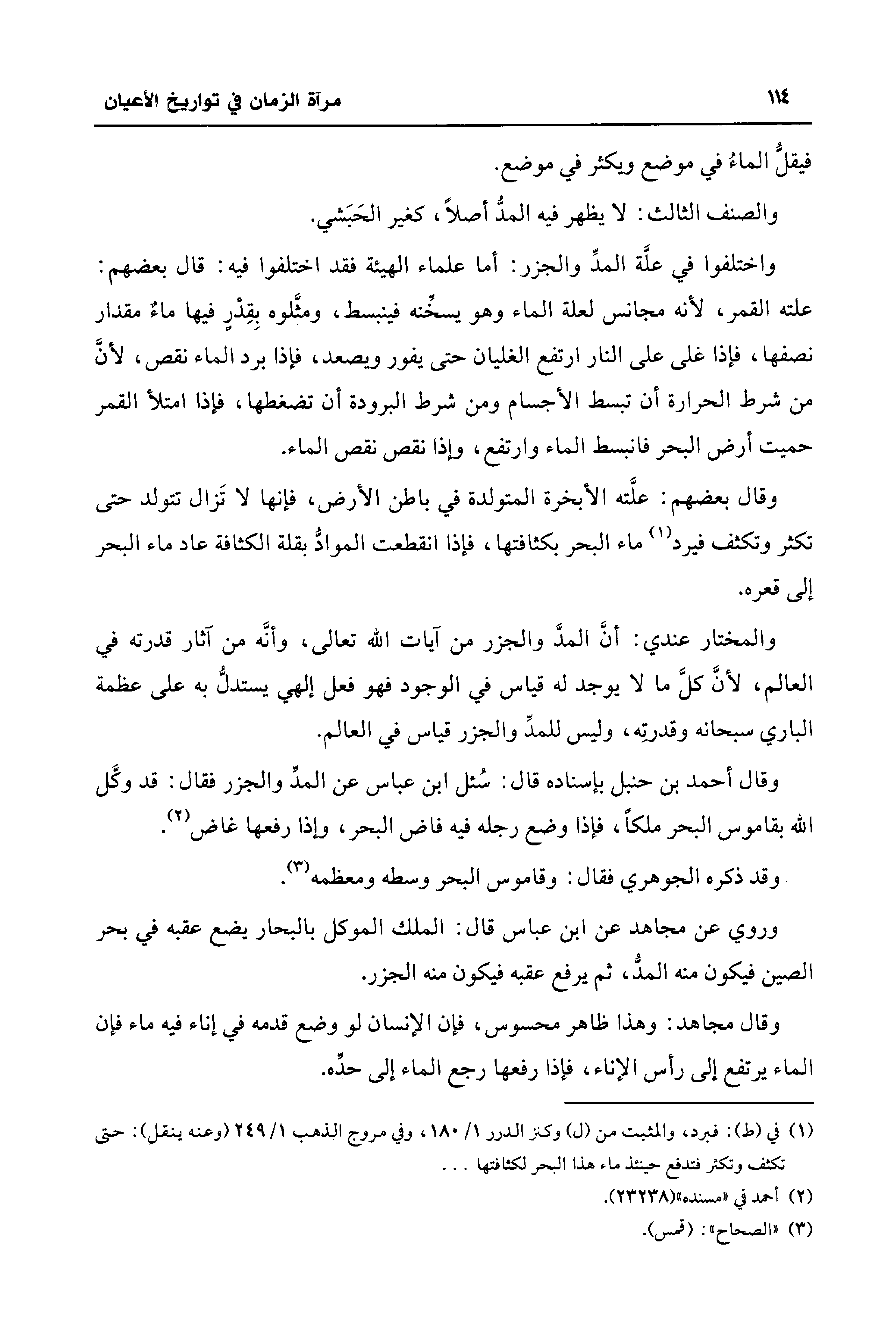 وقال بعضهم: علَّته الأبخرة المتولدة في باطن الأرض، فإنها لا تَزال تتولد حتى تكثر وتكثف فيرد (¬1) ماء البحر بكثافتها، فإذا انقطعت الموادُّ بقلة الكثافة عاد ماء البحر إلى قعره.