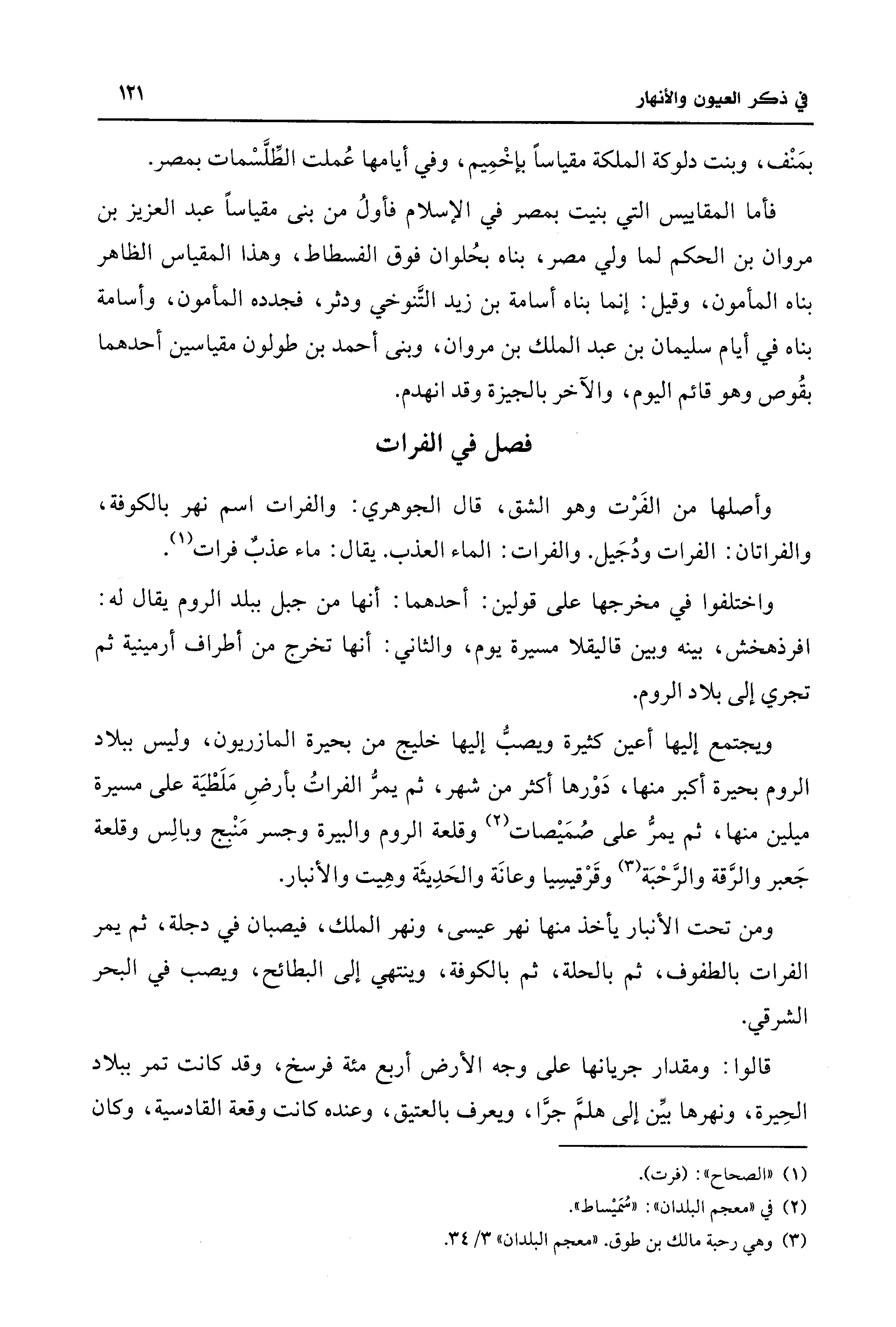 ويجتمع إليها أعين كثيرة ويصبُّ إليها خليج من بحيرة المازريون، وليس ببلاد الروم بحيرة أكبر منها، دَوْرها أكثر من شهو، ثم يمرُّ الفراتُ بأرضِ مَلَطْيَة على مسيرة ميلين منها، ثم يمرُّ على صُمَيصات (¬2) وقلعة الروم والبيرة وجسر مَنْبِج وبالِس وقلعة جَعبر والرَّقة والرَّحْبَة (¬3) وقَرْقيسِيا وعانَة والحَدِيثَة وهِيت والأنبار.